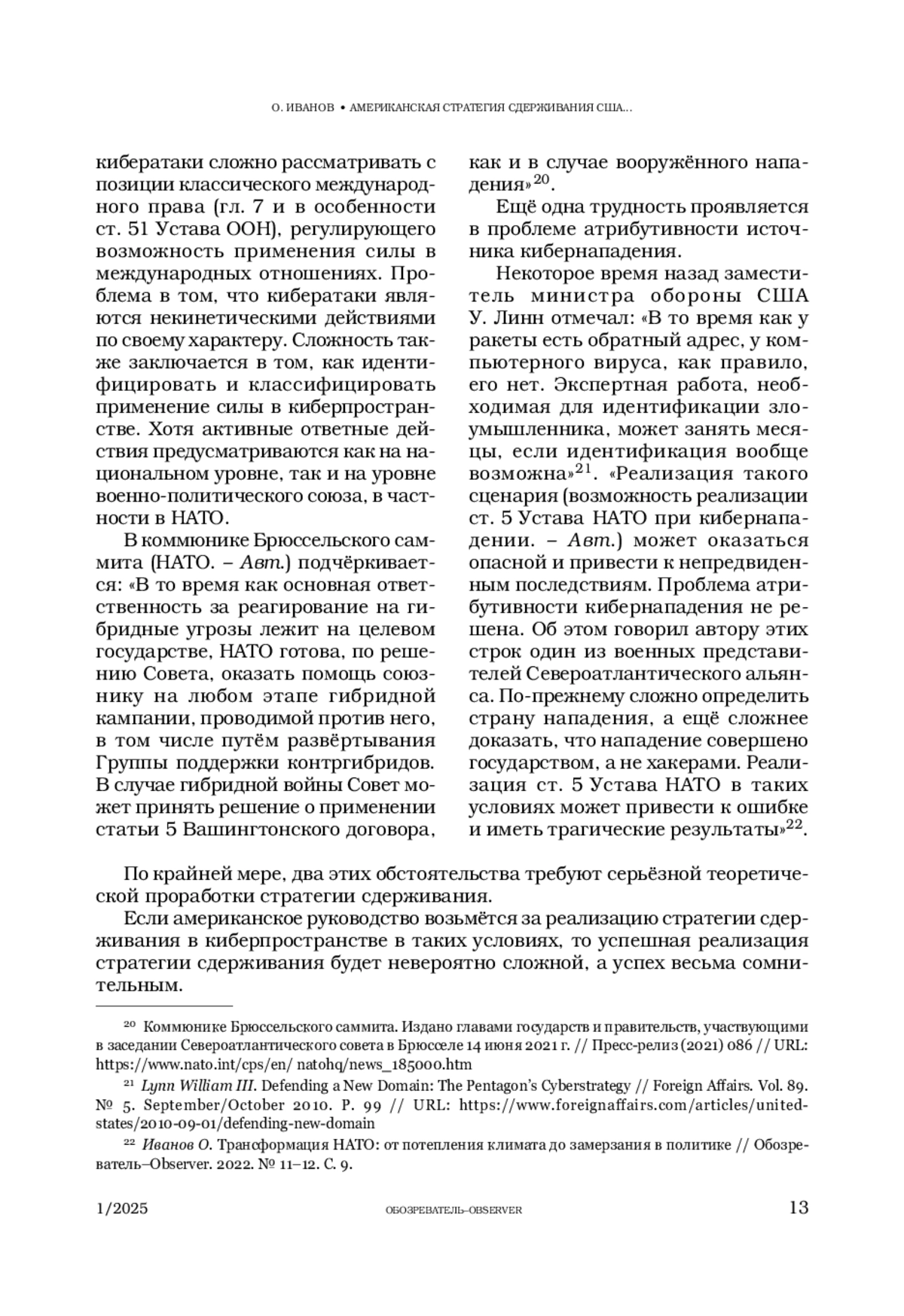 2. Иванов О. Трансформация НАТО: от потепления климата до замерзания в политике // Обозреватель-Observer. 2022. № 11-12. С. 5-16.