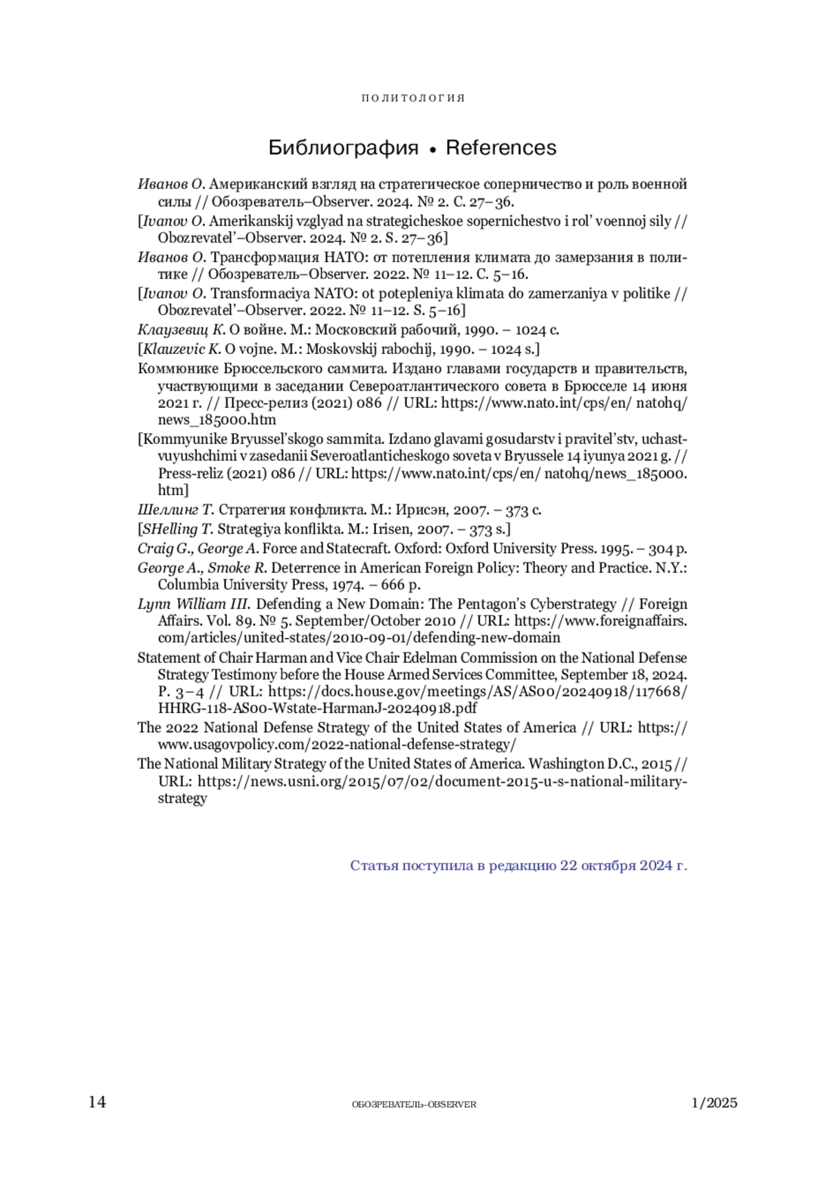 1. Иванов О. Американский взгляд на стратегическое соперничество и роль военной силы // Обозреватель-Observer. 2024. № 2. С. 27-36.