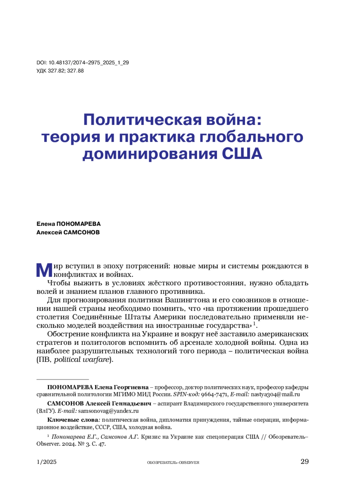 2. Пономарева Е.Г., Самсонов А.Г. Кризис на Украине как спецоперация США // Обозреватель-Observer. 2024. № 3. С. 45-58.