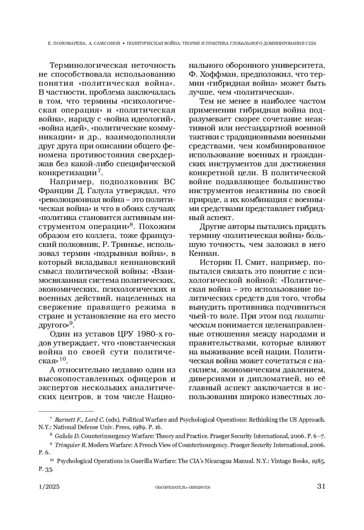 Авторы на основе доктринальных документов и научной литературы показали эволюцию понятия «политическая война». Теоретическая рамка, предложенная Дж. Ф. Кеннаном, за годы противостояния сверхдержав стала основой стратегического планирования Вашингтоном долгосрочных и разрушительных, в том числе тайных операций, по устранению влияния СССР в мире. Концептуально политическая война включает дипломатию принуждения, финансово-экономические способы давления, информационно-психологические и военно-политические операции. Весь этот арсенал в настоящее время направлен против России с целью подрыва её устойчивости и политической субъектности.