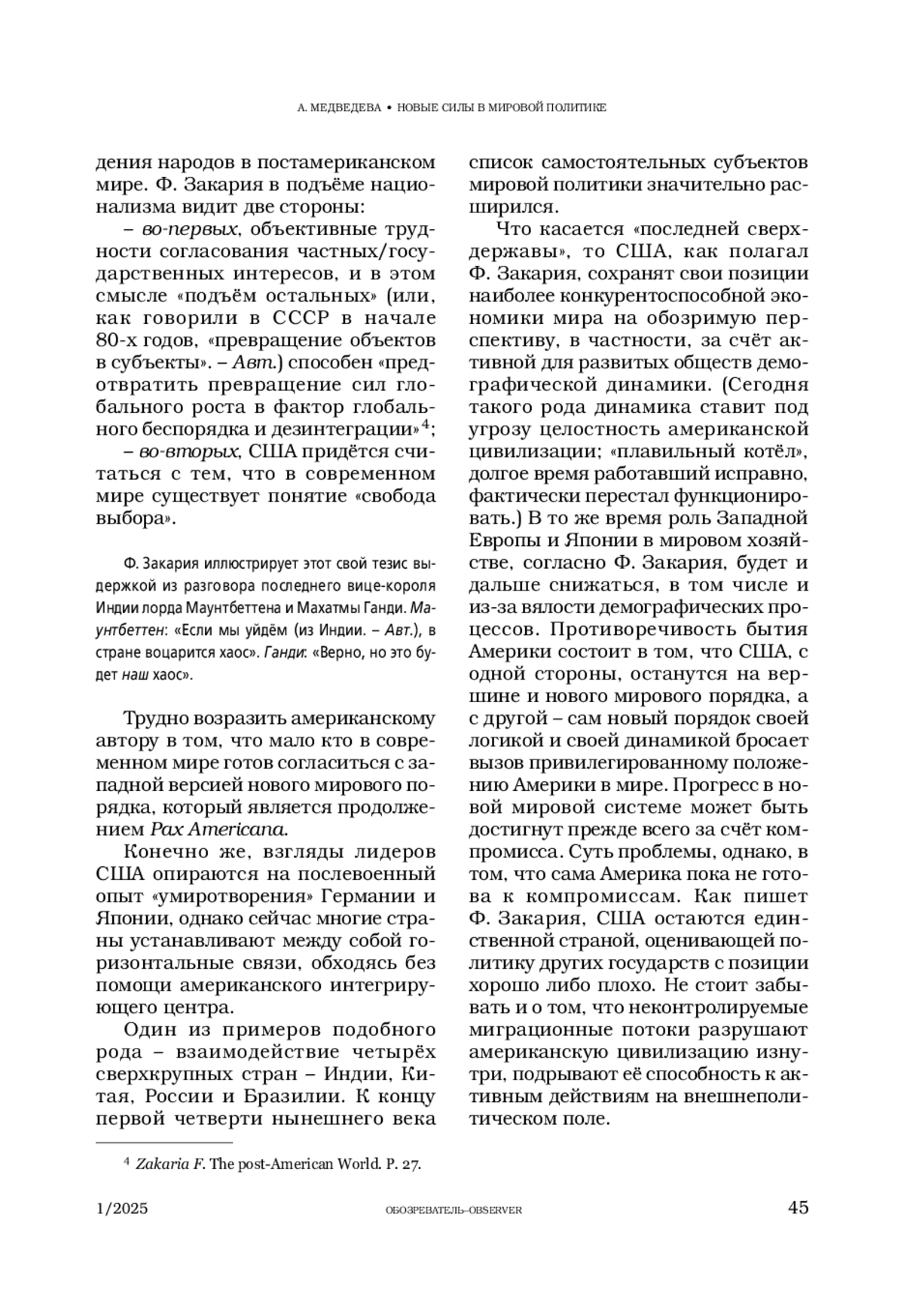 Можно сказать, что исторически постамериканский мир является логическим продолжением идеи нелиберальной демократии, предложенной автором* (2003 г.). Нелиберальная демократия – идея, с которой тогда выступил Ф. Закария, преследовала цель объяснить мыслящей Америке (да и Западу в целом) политическое многообразие современного мира, наличие различных моделей политического представительства и модернизации общества.