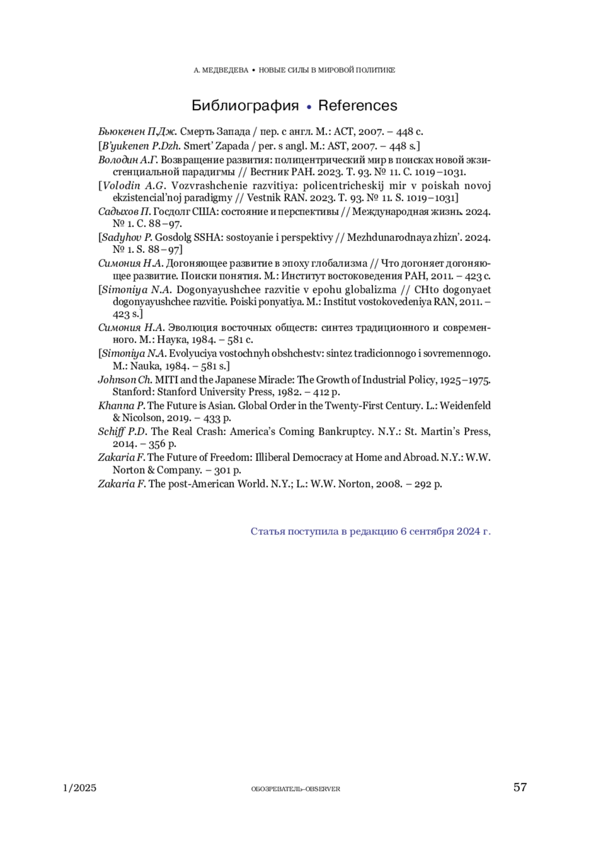 2. Володин А.Г. Возвращение развития: полицентрический мир в поисках новой экзистенциальной парадигмы // Вестник РАН. 2023. Т. 93. № 11. С. 1019-1031.