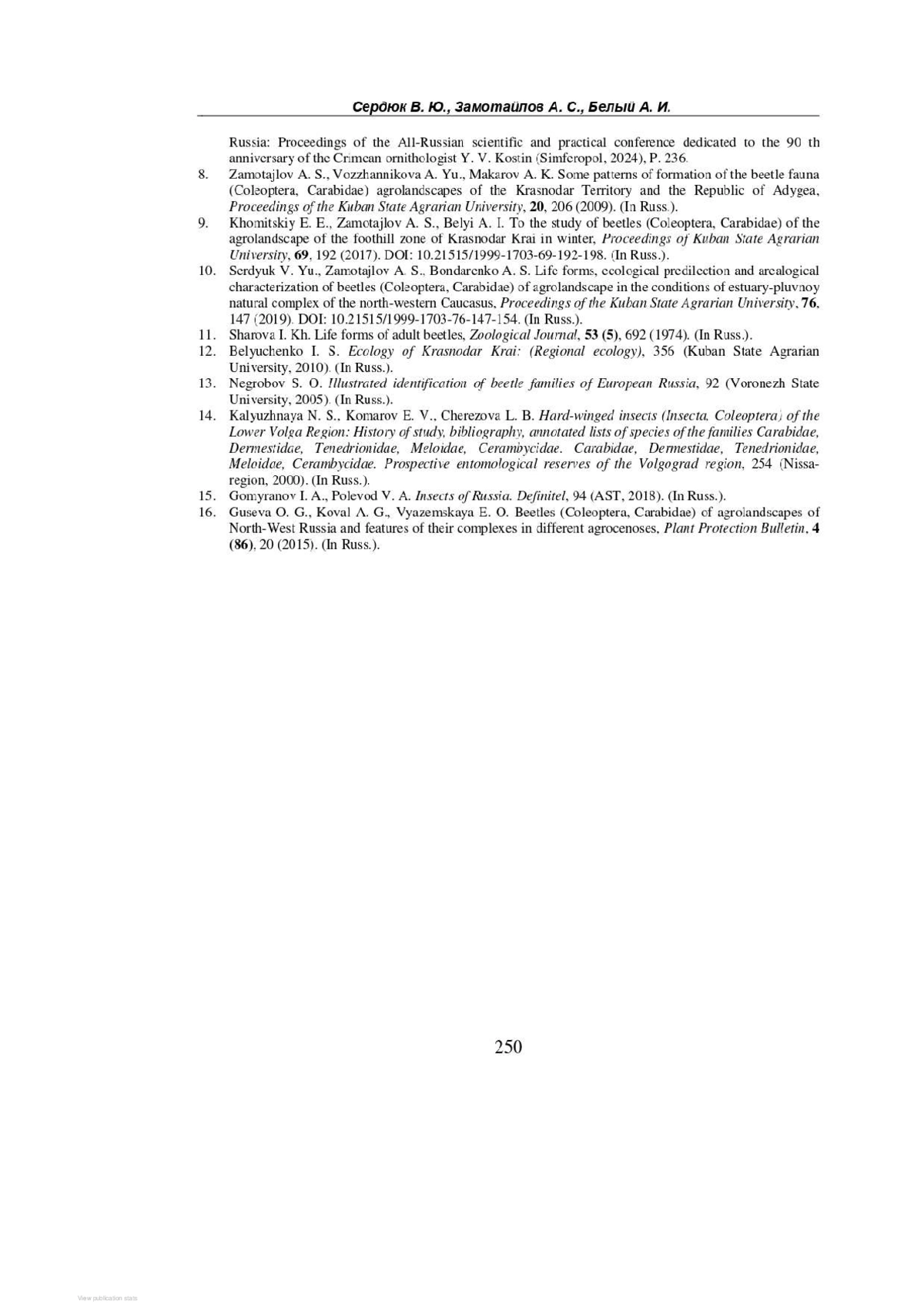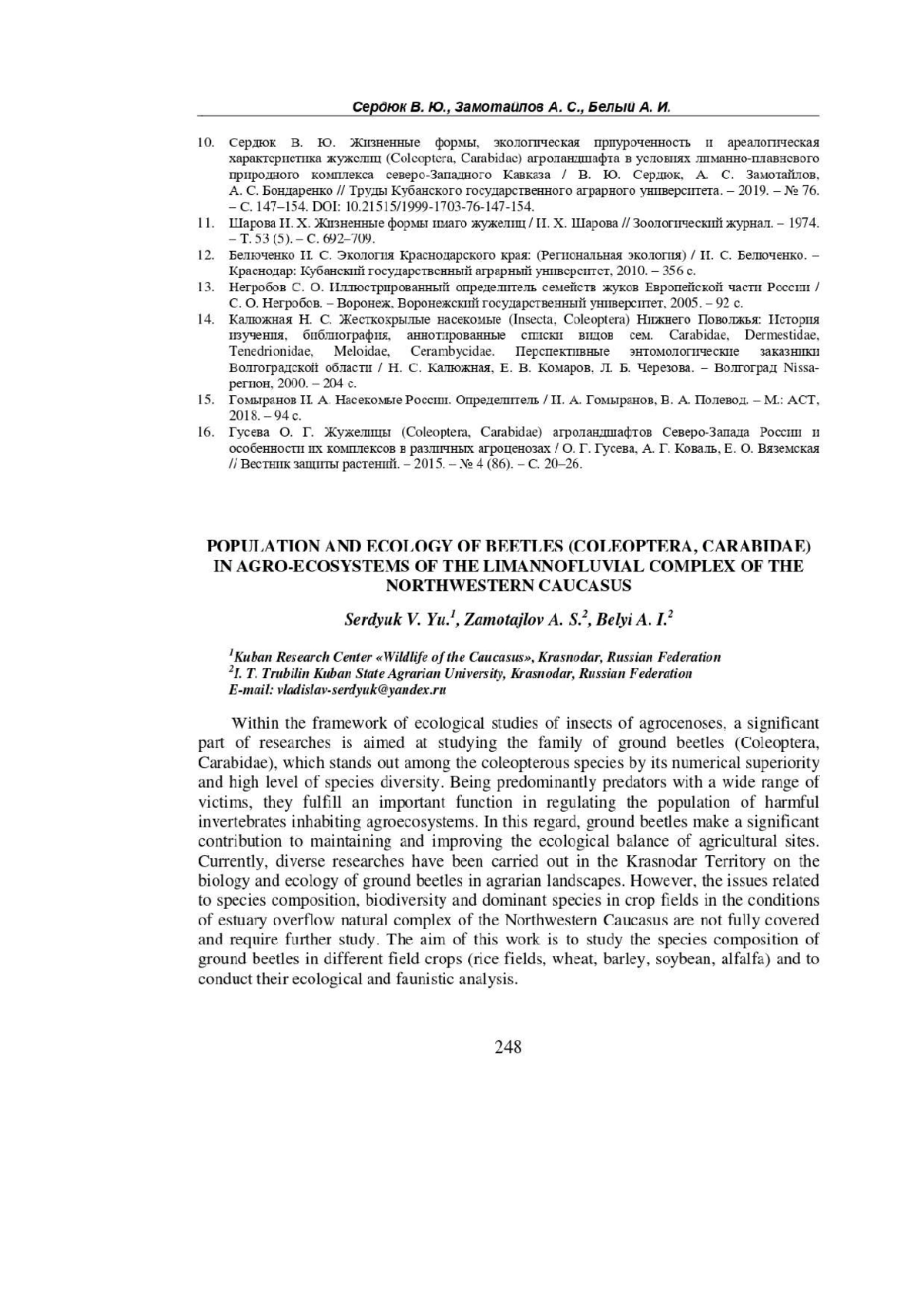 СЕРДЮК В. Ю., ЗАМОТАЙЛОВ А. С., БЕЛЫЙ А. И. ОСОБЕННОСТИ НАСЕЛЕНИЯ И ЭКОЛОГИИ ЖУЖЕЛИЦ (COLEOPTERA, CARABIDAE) АГРОЭКОСИСТЕМ ЛИМАННО-ПЛАВНЕВОГО КОМПЛЕКСА СЕВЕРО-ЗАПАДНОГО КАВКАЗА