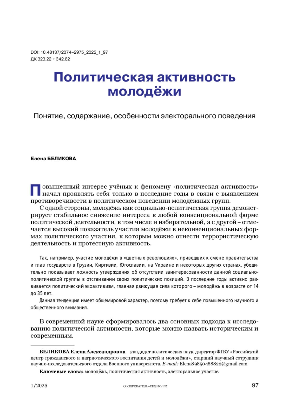 Обосновывая актуальность изучения вопросов политической активности молодёжи, автор рассматривает инновационный вид политической деятельности, характеризующийся, с одной стороны, значительным расширением круга участвующих и активистов, а с другой – увеличением количества пассивных наблюдателей, и даёт авторские определения понятий «политическая активность» и «политическая активность российской молодёжи».