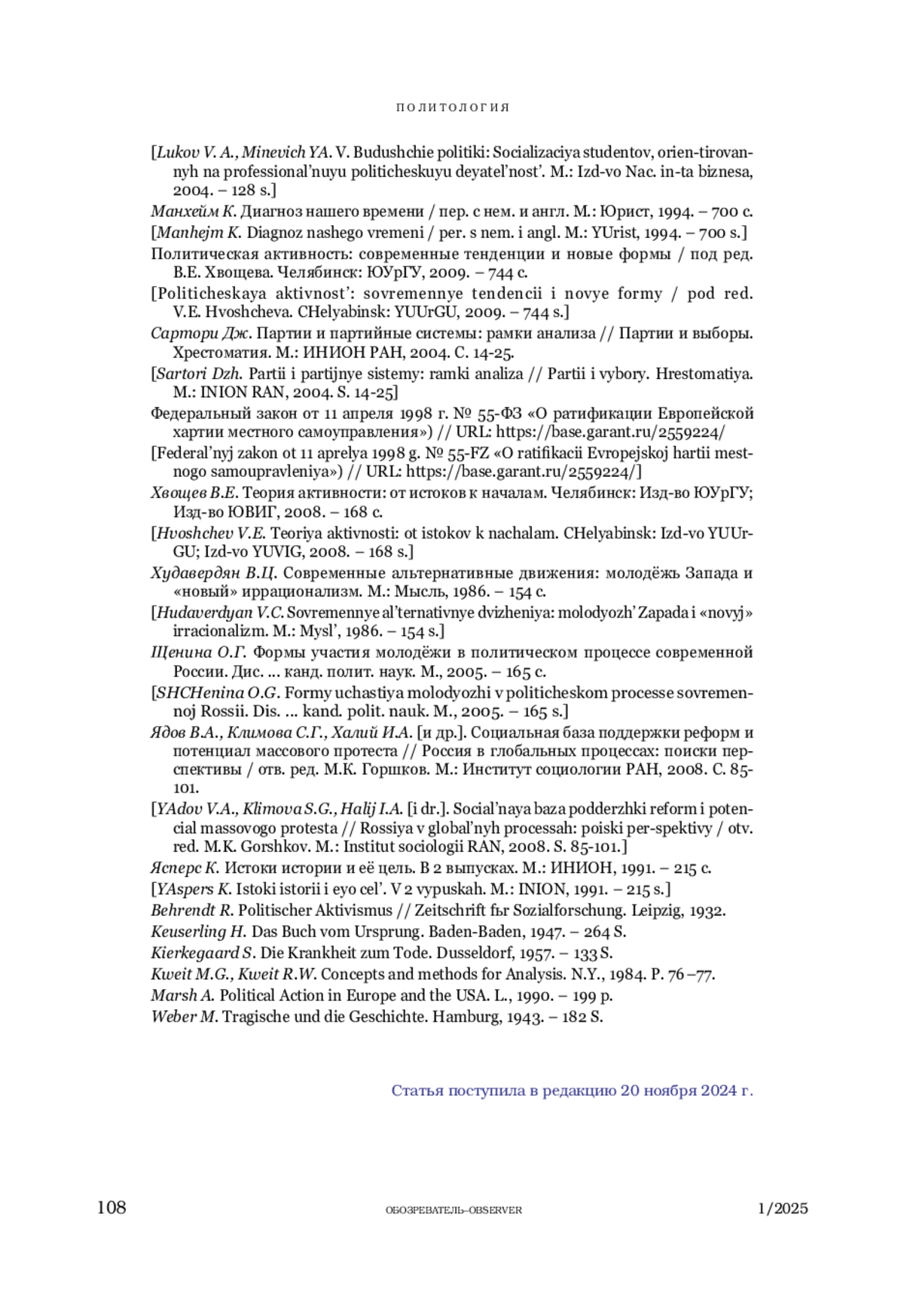 16. Ядов В.А., Климова С.Г., Халий И.А. [и др.]. Социальная база поддержки реформ и потенциал массового протеста // Россия в глобальных процессах: поиски перспективы / отв. ред. М.К. Горшков. М.: Институт социологии РАН, 2008. С. 85-101.