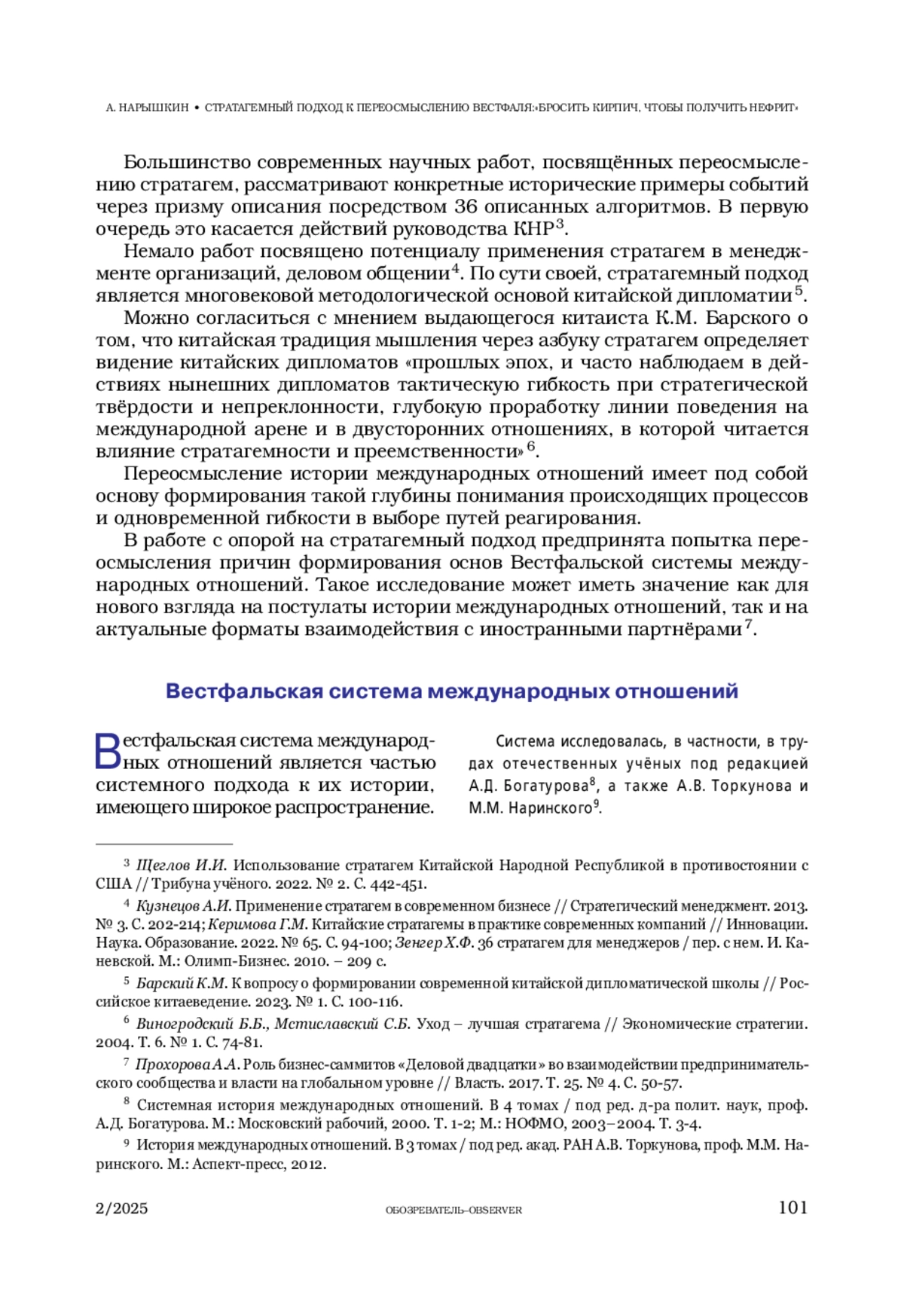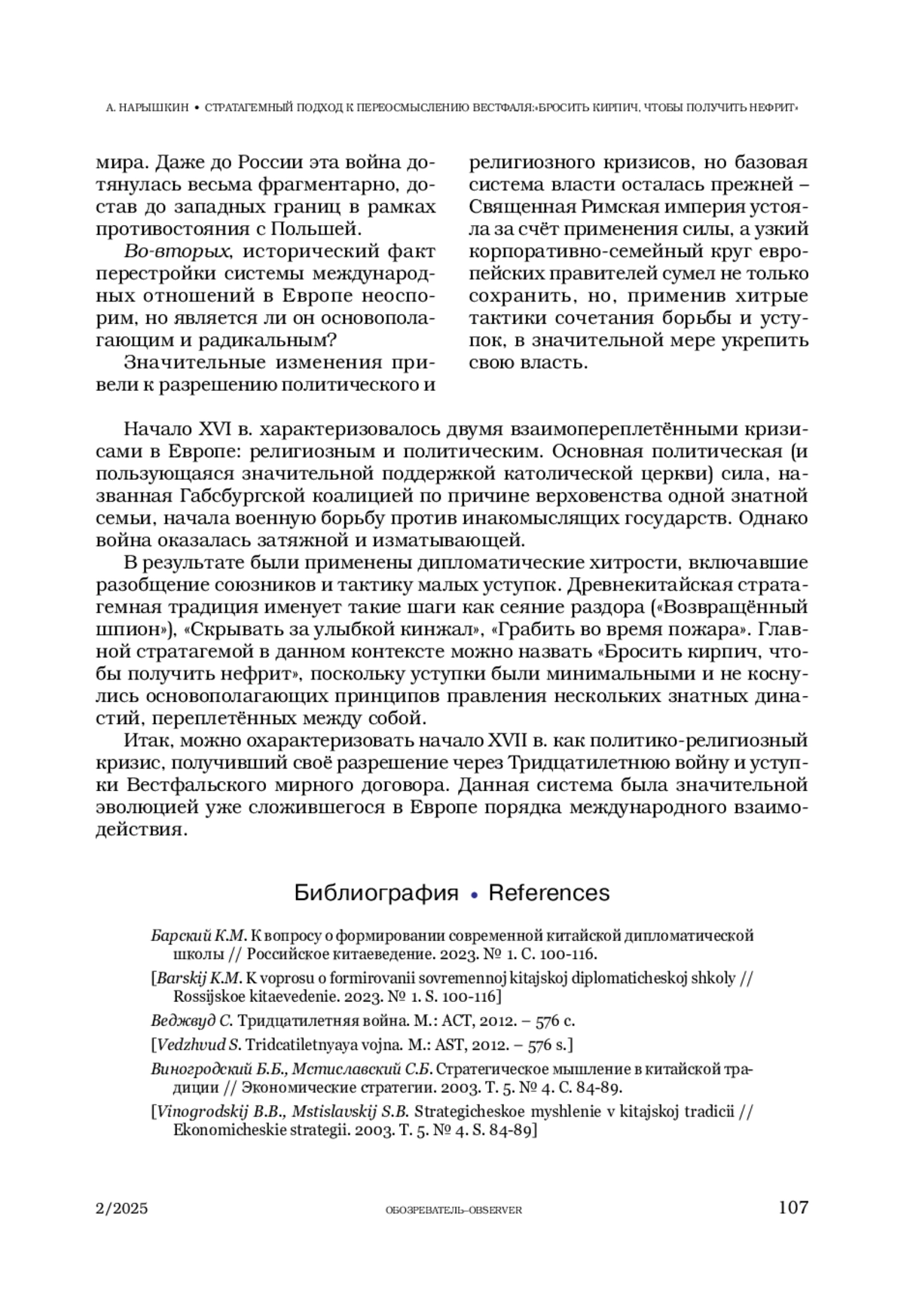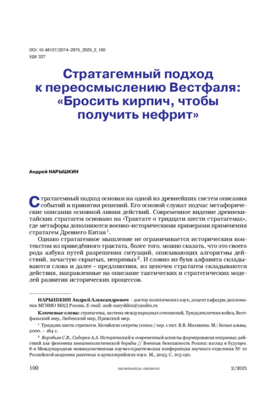 НАРЫШКИН А. А. СТРАТАГЕМНЫЙ ПОДХОД К ПЕРЕОСМЫСЛЕНИЮ ВЕСТФАЛЯ: «БРОСИТЬ КИРПИЧ, ЧТОБЫ ПОЛУЧИТЬ НЕФРИТ» // ОБОЗРЕВАТЕЛЬ. 2025. № 2