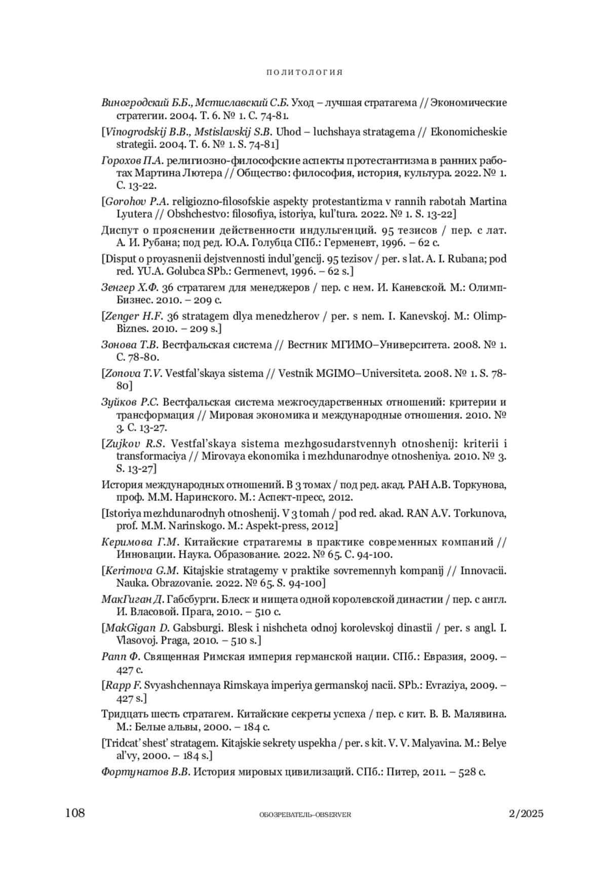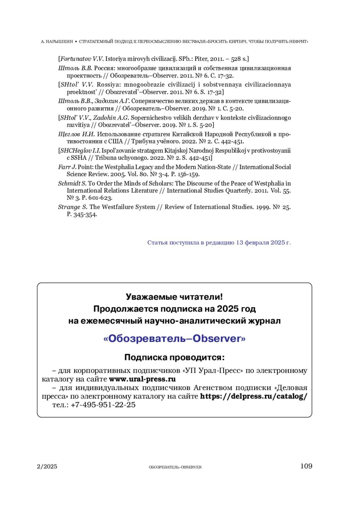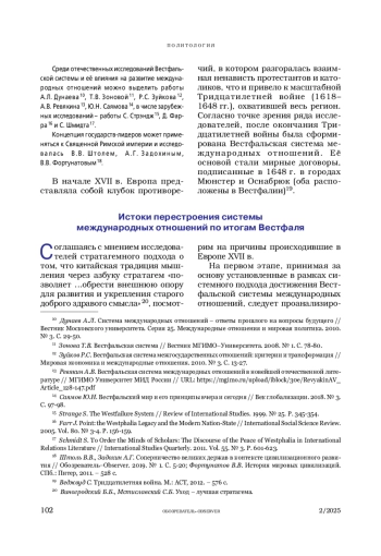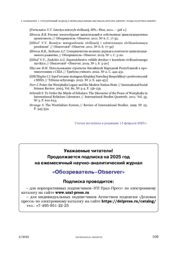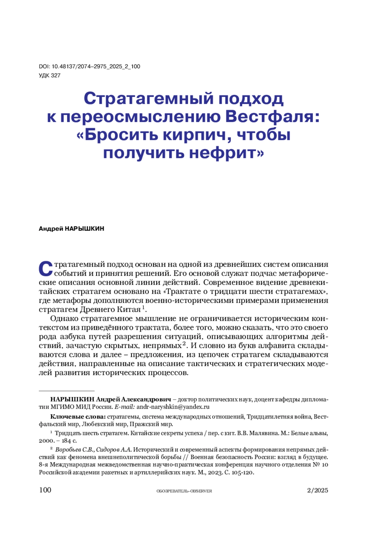 НАРЫШКИН А. А. СТРАТАГЕМНЫЙ ПОДХОД К ПЕРЕОСМЫСЛЕНИЮ ВЕСТФАЛЯ: «БРОСИТЬ КИРПИЧ, ЧТОБЫ ПОЛУЧИТЬ НЕФРИТ» // ОБОЗРЕВАТЕЛЬ. 2025. № 2
