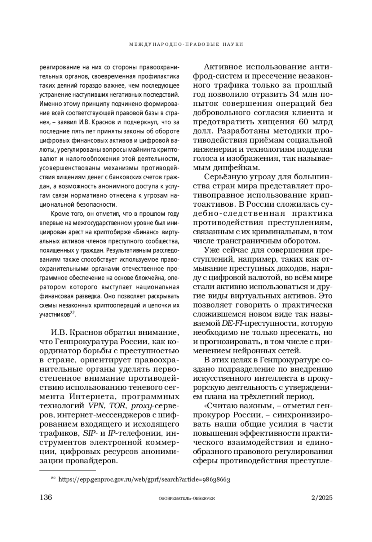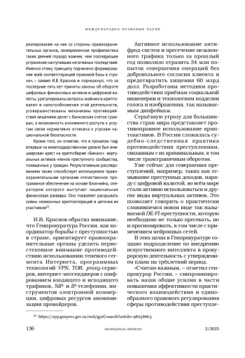 Автор анализирует задачи и деятельность Генеральной прокуратуры России по защите национальных интересов в информационной сфере, указывая на усиление антироссийской деятельности в связи с проведением СВО. Отмечена важность международной деятельности прокуратуры с использованием современных IT-технологий, не имеющих государственных границ.