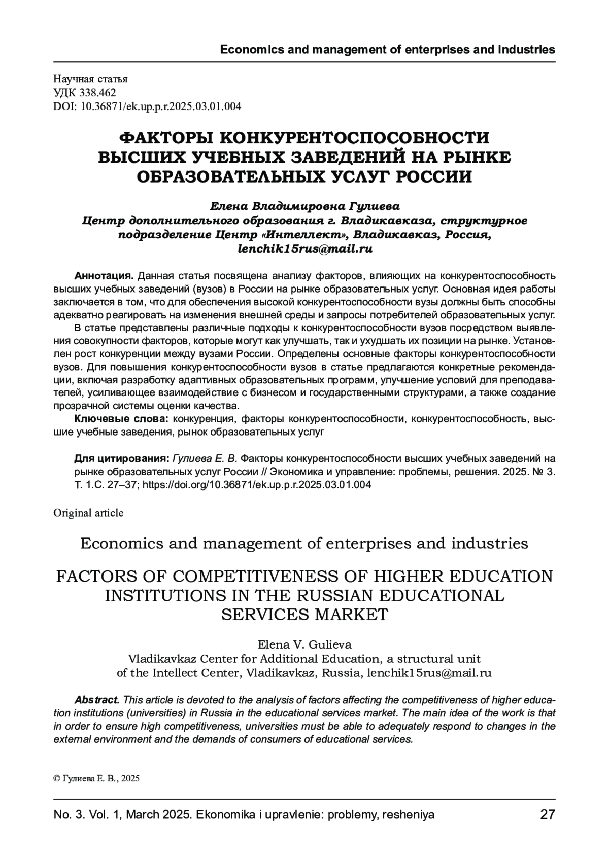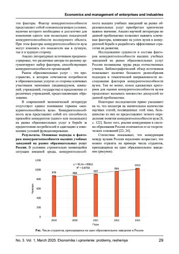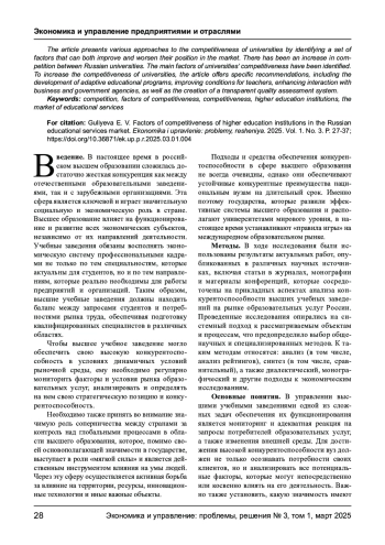 Данная статья посвящена анализу факторов, влияющих на конкурентоспособность высших учебных заведений (вузов) в России на рынке образовательных услуг. Основная идея работы заключается в том, что для обеспечения высокой конкурентоспособности вузы должны быть способны адекватно реагировать на изменения внешней среды и запросы потребителей образовательных услуг. В статье представлены различные подходы к конкурентоспособности вузов посредством выявления совокупности факторов, которые могут как улучшать, так и ухудшать их позиции на рынке. Установлен рост конкуренции между вузами России. Определены основные факторы конкурентоспособности вузов. Для повышения конкурентоспособности вузов в статье предлагаются конкретные рекомендации, включая разработку адаптивных образовательных программ, улучшение условий для преподавателей, усиливающее взаимодействие с бизнесом и государственными структурами, а также создание прозрачной системы оценки качества.