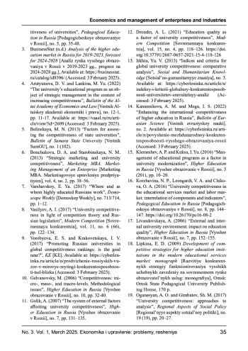 14. Канунникова А. М., Мога И. С. Повышение международной конкурентоспособности высшего образования России // Вестник евразийской науки. - 2022. - № 2. URL: https://cyberleninka.ru/article/n/povyshenie-mezhdunarodnoy-konkurentosposobnosti-vysshego-obrazovaniya-rossii (дата обращения: 03.02.2025). EDN: TBDJKD
