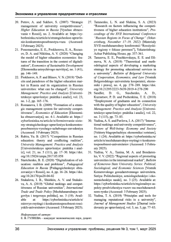9. Воробьева Е. С., Краковецкая И. В. Продвижение российских вузов в мировые рейтинги конкурентоспособности: цель близка? // КЭ. - 2017. - № 5. URL: https://cyberleninka.ru/article/n/prodvizhenie-rossiyskih-vuzov-vmirovye-reytingi-konkurentosposobnosti-tselblizka (дата обращения: 03.02.2025).