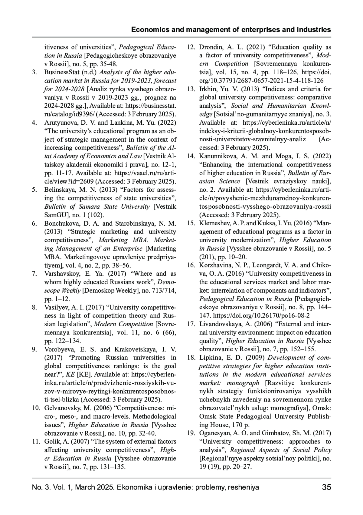 8. Васильев А. И. Конкурентоспособность вуза в свете теории конкуренции и норм российского законодательства // Современная конкуренция. - 2017. - Т. 11, № 6 (66). - С. 122-134. EDN: YNJOAX
