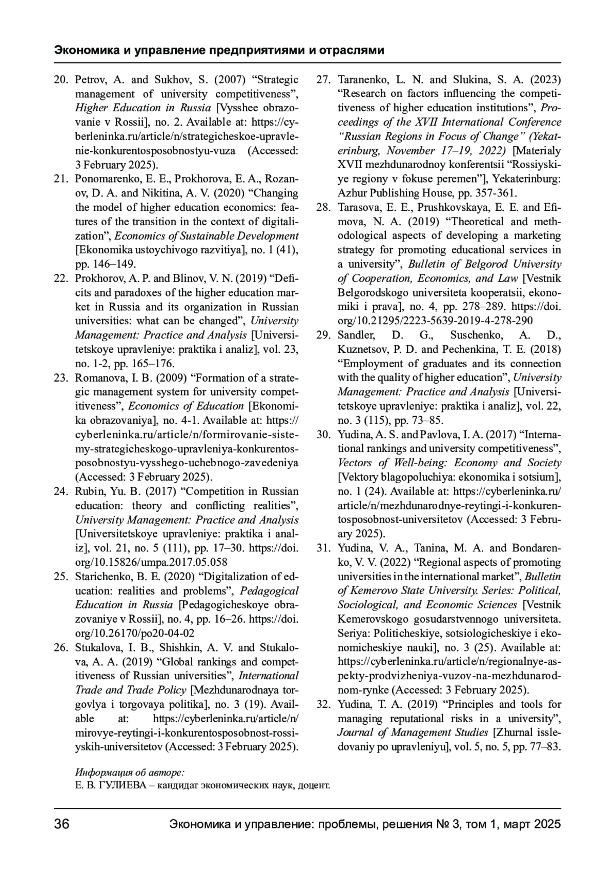 32. Юдина Т. А. Принципы и инструменты управления репутационными рисками университета // Журнал исследований по управлению. - 2019. - Т. 5, № 5. - С. 77-83. EDN: JQHYDU