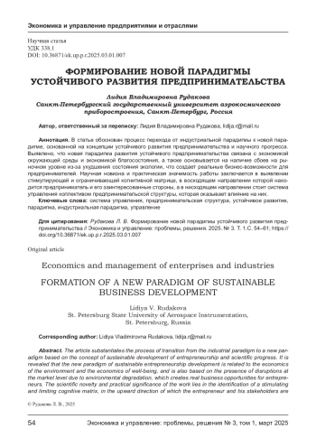 В статье обоснован процесс перехода от индустриальной парадигмы к новой парадигме, основанной на концепции устойчивого развития предпринимательства и научного прогресса. Выявлено, что новая парадигма развития устойчивого предпринимательства связана с экономикой окружающей среды и экономикой благосостояния, а также основывается на наличие сбоев на рыночном уровне из-за ухудшения состояния экологии, что создает реальные бизнес-возможности для предпринимателей. Научная новизна и практическая значимость работы заключается в выявлении стимулирующей и ограничивающей когнитивной матрице, в восходящем направлении которой находится предприниматель и его заинтересованные стороны, а в нисходящем направлении стоит система управления коллективом предпринимательской структуры, которая оказывает влияние на них.