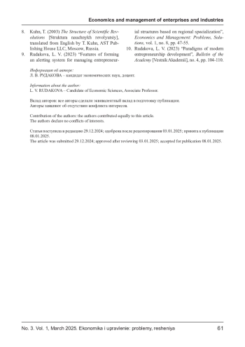 9. Рудакова Л. В. Особенности формирования алертинговой системы управления предпринимательскими структурами на основе региональной специализации // Научно-практический теоретический журнал “Экономика и управление: проблемы, решения”. - М.: ИД “Научная библиотека”, 2023. - № 8, Т. 1. - С. 47-55.