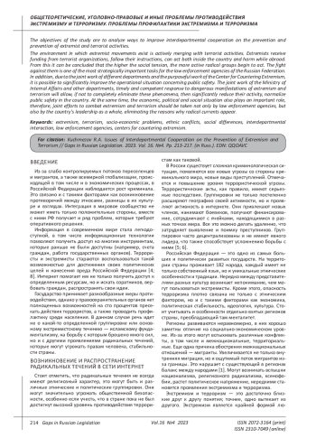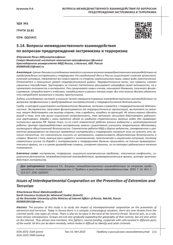7. Кодзокова Л.А., Шигалугова М.Х. Некоторые аспекты сотрудничества в сфере борьбы с экстремизмом и терроризмом // Образование и право. 2022. № 7. С. 291-296. EDN: OGDCNP