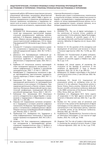 10. Шогенов Т.М. Роль современных информационных инструментов в противодействии распространению террористических угроз // Пробелы в российском законодательстве. 2022. Т. 15. № 5. С. 77-81. EDN: SOUZTI