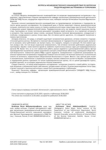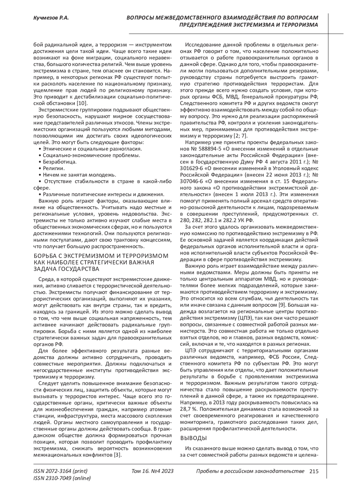 2. Гутиева И.Г. К вопросу о возникновении и развитии экстремизма и терроризма в России // Евразийский юридический журнал. 2022. № 7 (170). С. 410-411. EDN: VBBNUE