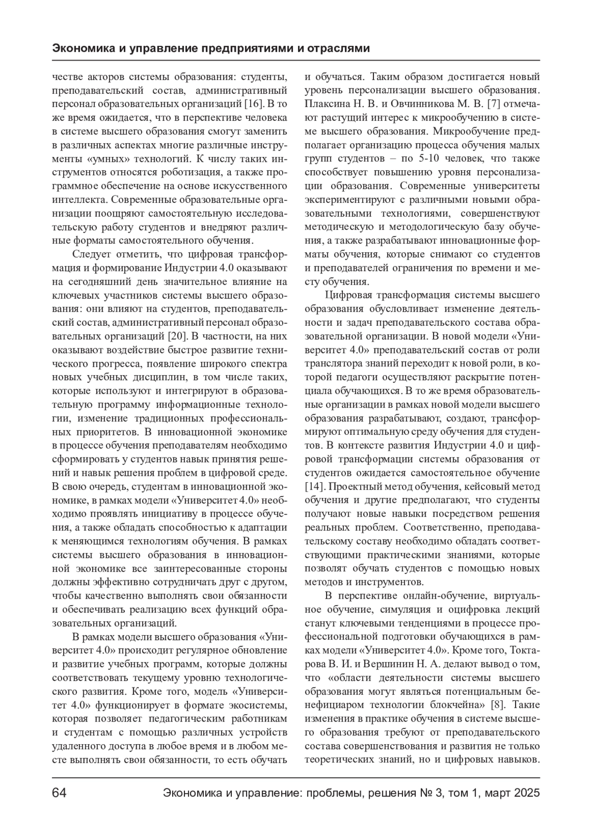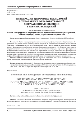 Статья посвящена проблематике интеграции цифровых технологий в управление образовательной деятельностью высших учебных заведений. В условиях формирования инновационной экономики и развития Индустрии 4.0 происходит цифровая трансформация системы высшего образования и формирование новой модели системы образования «Университет 4.0». В рамках новой модели предполагается активное использование цифровых технологий в процессе обучения и формирование в образовательных организациях современной образовательной среды. Целесообразно формирование в вузах цифровой экосистемы, включающей различные элементы - от цифровой библиотеки до цифрового диплома в системе блокчейн. В статье представлен комплекс ключевых рекомендаций по развитию цифровой трансформации системы высшего образования в условиях инновационной экономики.
