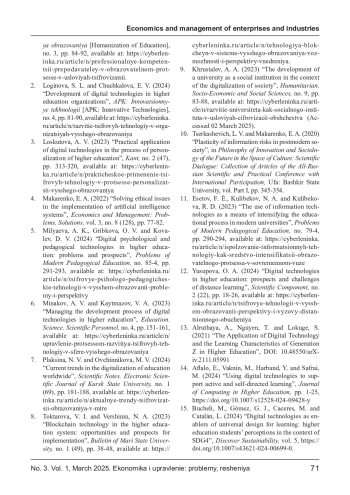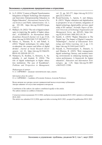 19. Nurtayeva D., Kredina A., Kireyeva A., Satybaldin A., Ainakul N. The role of digital technologies in higher education institutions: The case of Kazakhstan // Problems and Perspectives in Management. - 2024. - Vol. 22. - 562-577. DOI: 10.21511/ppm.22(1).2024.45 EDN: SISQTE