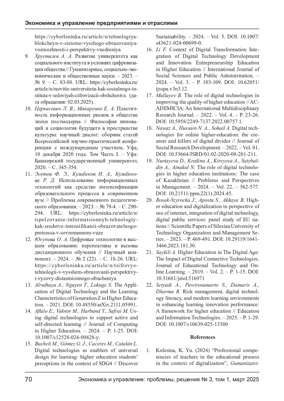 22. Setyadi A., Pawirosumarto S., Damaris A., Dharma R. Risk management, digital technology literacy, and modern learning environments in enhancing learning innovation performance: A framework for higher education // Education and Information Technologies. - 2025. - Р. 1-29. DOI: 10.1007/s10639-025-13380
