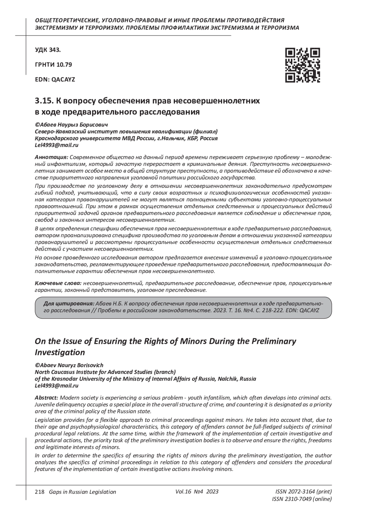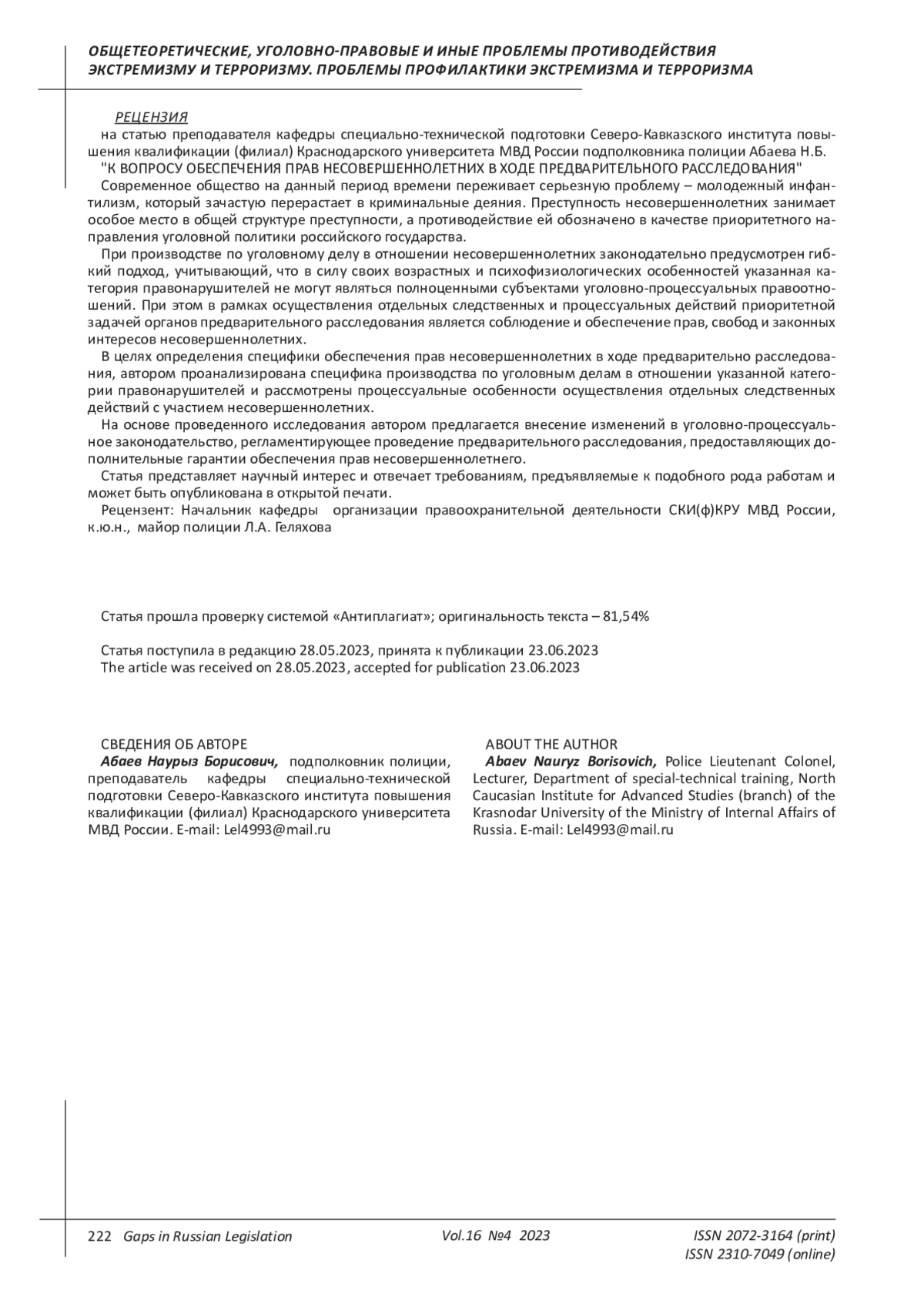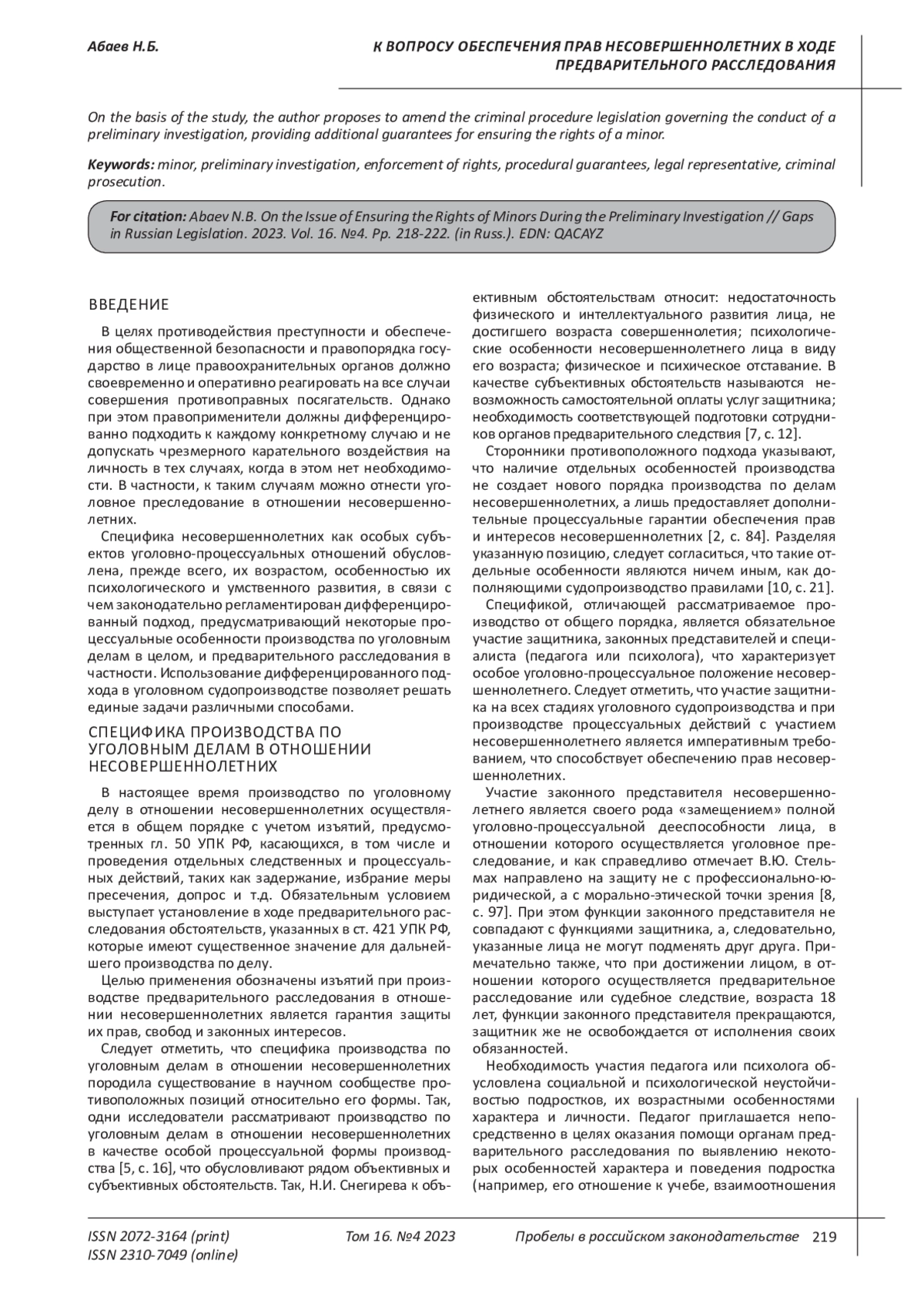 Berova D.M., Tutukov A.Yu. Criminal procedural features of the interrogation of minors during the preliminary investigation // Gaps in Russian legislation. 2019. No. 2. EDN: VZNWQZ