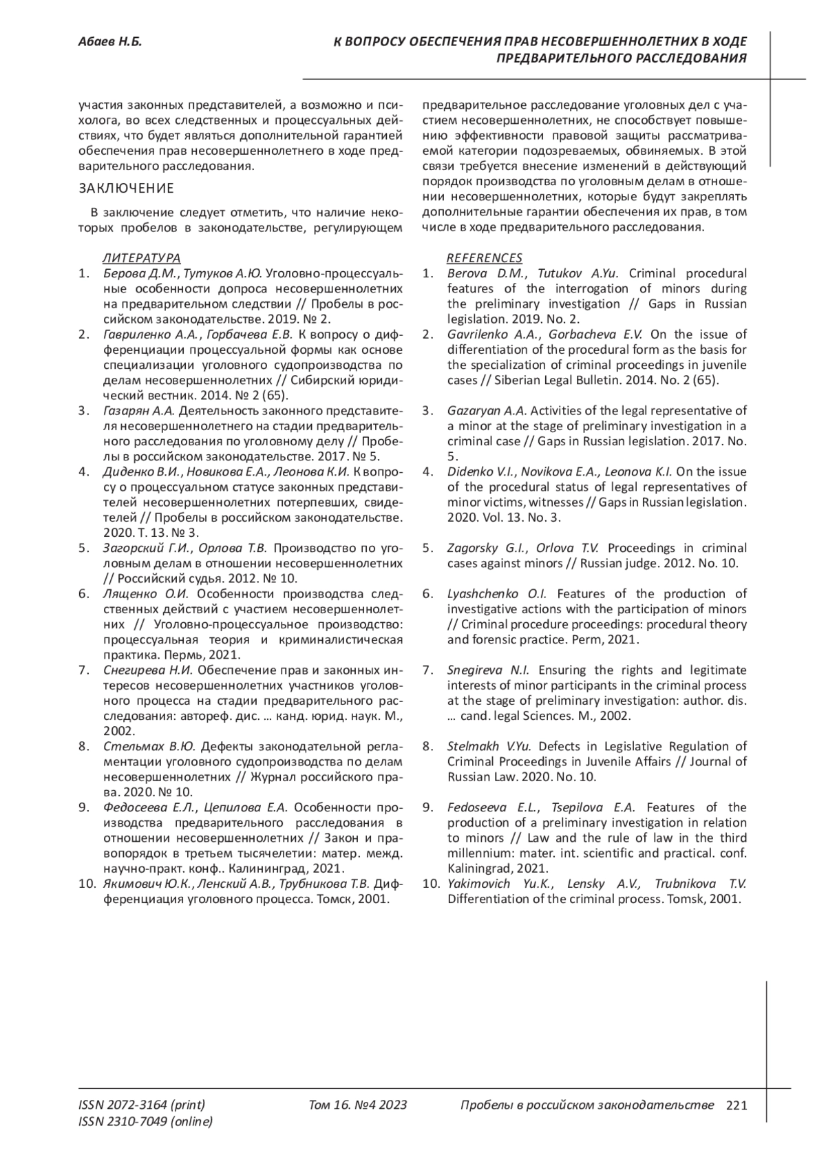 8. Стельмах В.Ю. Дефекты законодательной регламентации уголовного судопроизводства по делам несовершеннолетних // Журнал российского права. 2020. № 10. EDN: HMVBAR