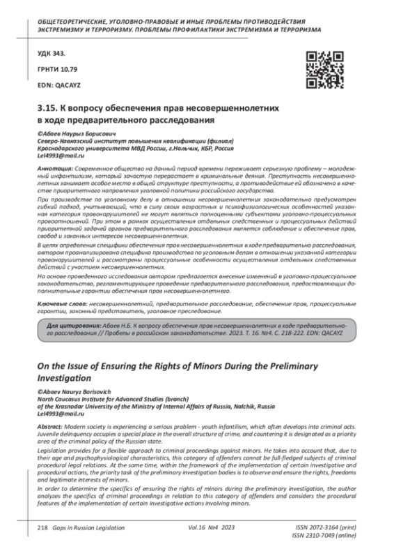 Современное общество на данный период времени переживает серьезную проблему - молодежный инфантилизм, который зачастую перерастает в криминальные деяния. Преступность несовершеннолетних занимает особое место в общей структуре преступности, а противодействие ей обозначено в качестве приоритетного направления уголовной политики российского государства. При производстве по уголовному делу в отношении несовершеннолетних законодательно предусмотрен гибкий подход, учитывающий, что в силу своих возрастных и психофизиологических особенностей указанная категория правонарушителей не могут являться полноценными субъектами уголовно-процессуальных правоотношений. При этом в рамках осуществления отдельных следственных и процессуальных действий приоритетной задачей органов предварительного расследования является соблюдение и обеспечение прав, свобод и законных интересов несовершеннолетних. В целях определения специфики обеспечения прав несовершеннолетних в ходе предварительно расследования, автором проанализирована специфика производства по уголовным делам в отношении указанной категории правонарушителей и рассмотрены процессуальные особенности осуществления отдельных следственных действий с участием несовершеннолетних. На основе проведенного исследования автором предлагается внесение изменений в уголовно-процессуальное законодательство, регламентирующее проведение предварительного расследования, предоставляющих дополнительные гарантии обеспечения прав несовершеннолетнего.