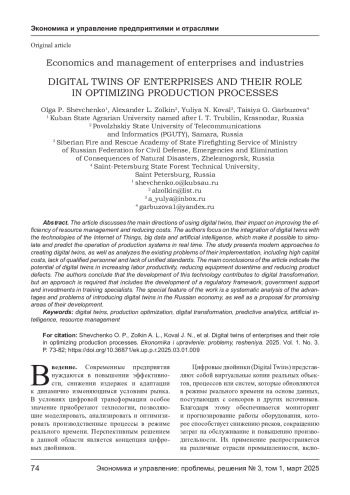 В статье рассматриваются основные направления использования цифровых двойников, их влияние на повышение эффективности управления ресурсами и сокращение затрат. Авторы акцентируют внимание на интеграции цифровых двойников с технологиями Интернета вещей, больших данных и искусственного интеллекта, которые позволяют моделировать и прогнозировать работу производственных систем в режиме реального времени. В исследовании представлены современные подходы к созданию цифровых двойников, а также проведен анализ существующих проблем их внедрения, включая высокие капитальные затраты, нехватку квалифицированных кадров и отсутствие унифицированных стандартов. Основные выводы статьи свидетельствуют о потенциале цифровых двойников в повышении производительности труда, сокращении простоев оборудования и снижении уровня дефектов в продукции. Авторы приходят к заключению, что развитие данной технологии способствует цифровой трансформации, однако требуется реализация подхода, включающего развитие нормативно-правовой базы, государственную поддержку и инвестиции в подготовку специалистов. Особенность работы заключается в системном анализе преимуществ и проблем внедрения цифровых двойников в отрасли российской экономики, а также в предложении перспективных направлений их развития.