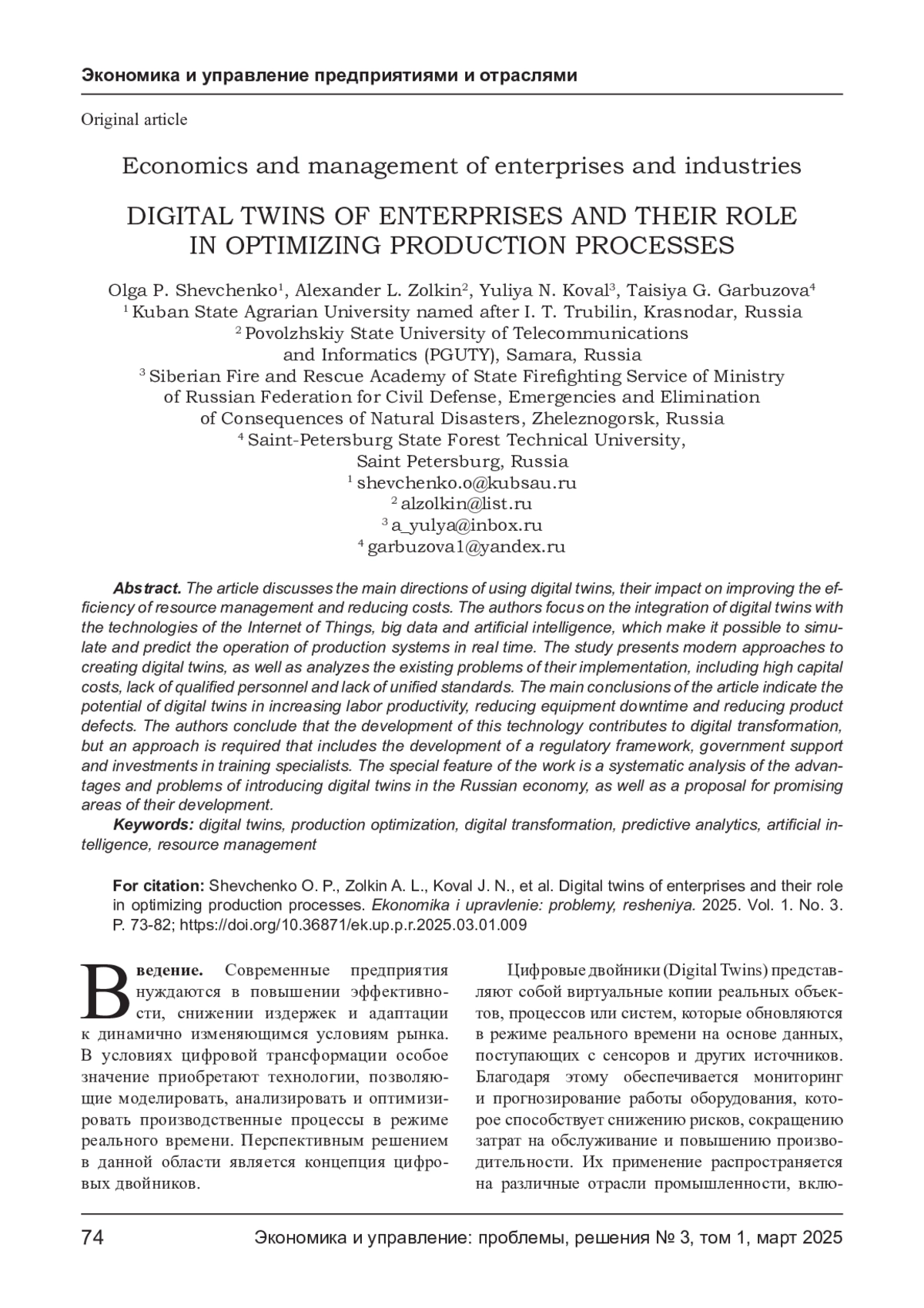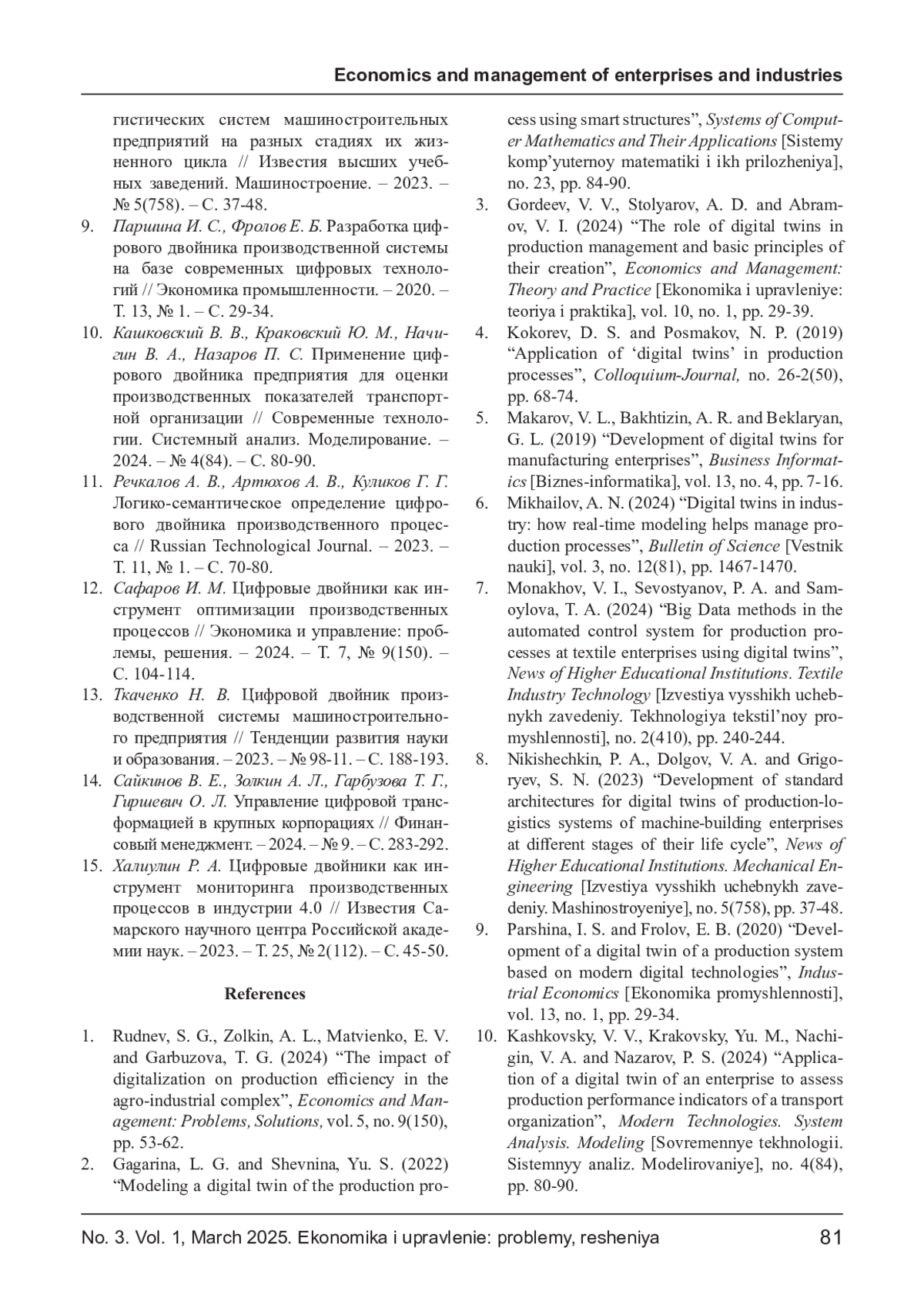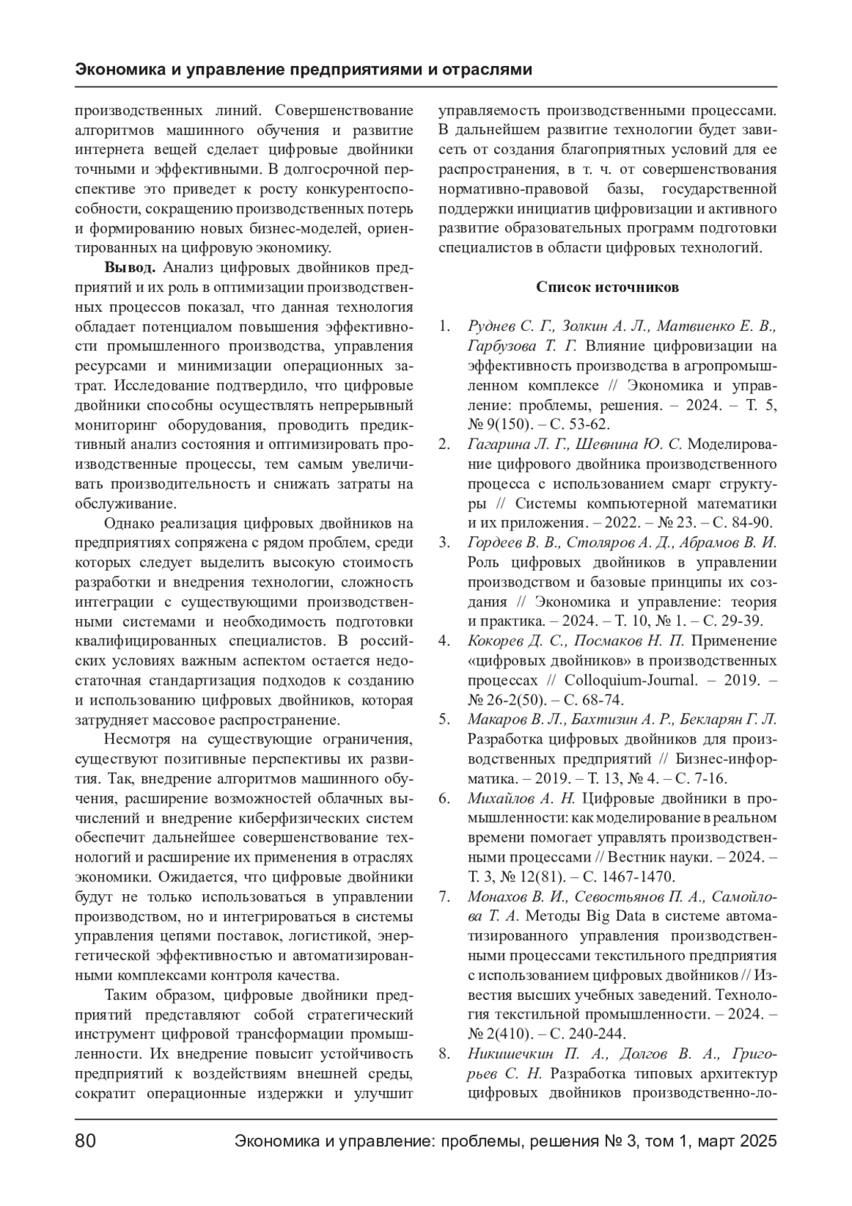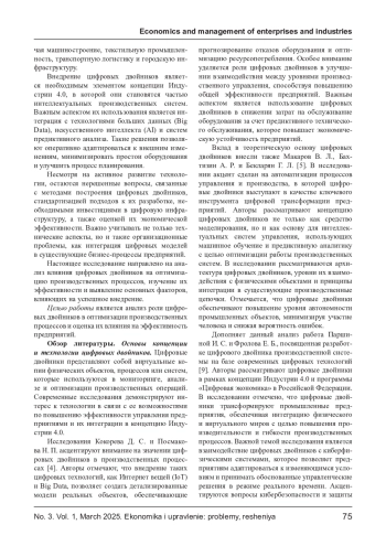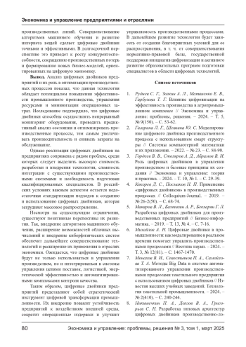 3. Гордеев В. В., Столяров А. Д., Абрамов В. И. Роль цифровых двойников в управлении производством и базовые принципы их создания // Экономика и управление: теория и практика. - 2024. - Т. 10, № 1. - С. 29-39. EDN: FOTNAH