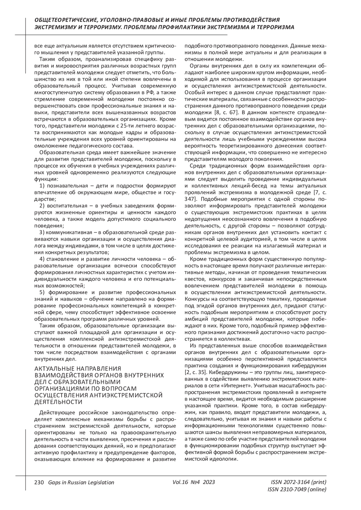Борьба с проявлениями экстремизма осуществляется многими органами государственной власти, и основные полномочия в рамках указанной деятельности закрепляются за органами внутренних дел. Несмотря на эффективность процесса выявления, пресечения и расследования противоправных деяний экстремистской направленности, указанное явление активно развивается и трансформируется в российском обществе. Среди актуальных тенденций распространения экстремистской идеологии следует выделить существенный интерес отдельных категорий населения к соответствующим противоправным идеям и взглядам, среди которых наибольшую выраженность имеет вовлеченность молодежи в вышеназванные процессы. Целью представленного исследования выступает анализ применяемых органами внутренних дел мер по противодействию молодежному экстремизму в образовательной среде. Автор приходит к выводу о том, что образовательные организации выступают важной площадкой для организации и осуществления комплексной антиэкстремистской деятельности в отношении представителей молодежи, в том числе посредством взаимодействия с органами внутренних дел. Акцентируется внимание на том, что к настоящему моменту имеется множество способов совместной деятельности органов внутренних дел и образовательных организаций в целях борьбы с распространением экстремистской деятельности среди молодежи. Отмечается необходимость тесного контакта вышеназванных субъектов антиэкстремистской деятельности, в том числе в целях учета специфики молодежных коллективов в конкретных учебных заведениях в процессе организации и проведения совместных мероприятий. Сформулированы рекомендации по взаимодействию органов внутренних дел с образовательными организациями и определена перспективность использования конкретных форм и методов антиэкстремистской деятельности, что может быть использовано для повышения эффективности соответствующей работы.