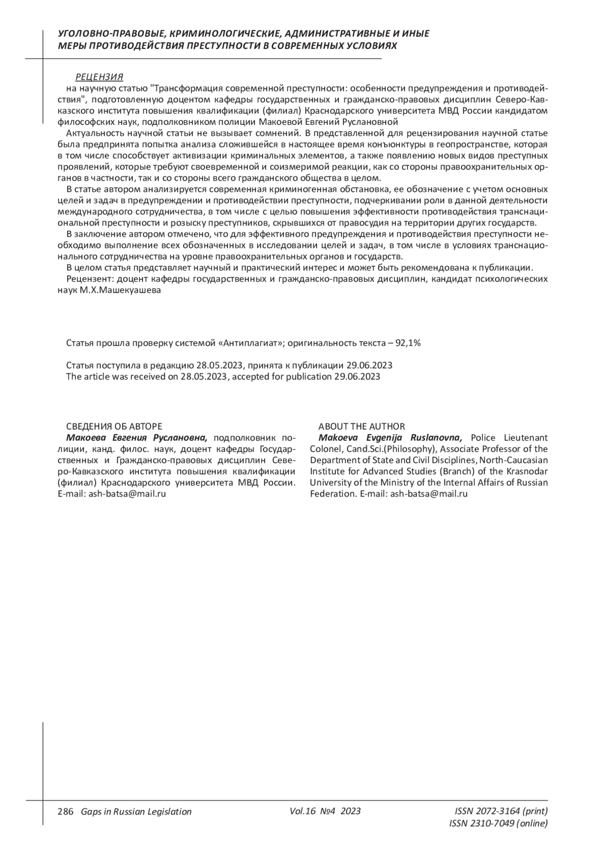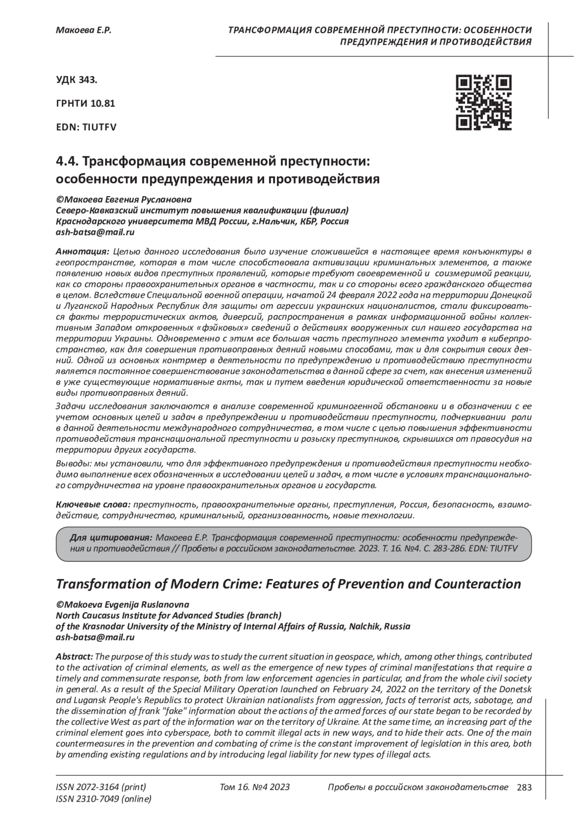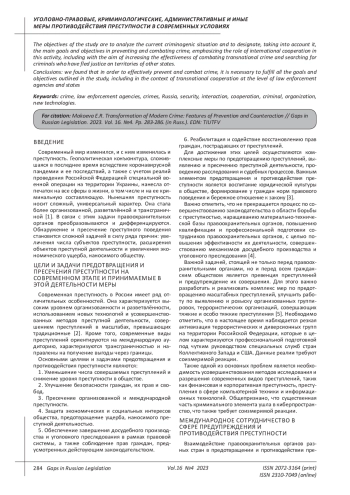 Целью данного исследования было изучение сложившейся в настоящее время конъюнктуры в геопространстве, которая в том числе способствовала активизации криминальных элементов, а также появлению новых видов преступных проявлений, которые требуют своевременной и соизмеримой реакции, как со стороны правоохранительных органов в частности, так и со стороны всего гражданского общества в целом. Вследствие Специальной военной операции, начатой 24 февраля 2022 года на территории Донецкой и Луганской Народных Республик для защиты от агрессии украинских националистов, стали фиксироваться факты террористических актов, диверсий, распространения в рамках информационной войны коллективным Западом откровенных «фэйковых» сведений о действиях вооруженных сил нашего государства на территории Украины. Одновременно с этим все большая часть преступного элемента уходит в киберпространство, как для совершения противоправных деяний новыми способами, так и для сокрытия своих деяний. Одной из основных контрмер в деятельности по предупреждению и противодействию преступности является постоянное совершенствование законодательства в данной сфере за счет, как внесения изменений в уже существующие нормативные акты, так и путем введения юридической ответственности за новые виды противоправных деяний. Задачи исследования заключаются в анализе современной криминогенной обстановки и в обозначении с ее учетом основных целей и задач в предупреждении и противодействии преступности, подчеркивании роли в данной деятельности международного сотрудничества, в том числе с целью повышения эффективности противодействия транснациональной преступности и розыску преступников, скрывшихся от правосудия на территории других государств. Выводы: мы установили, что для эффективного предупреждения и противодействия преступности необходимо выполнение всех обозначенных в исследовании целей и задач, в том числе в условиях транснационального сотрудничества на уровне правоохранительных органов и государств.