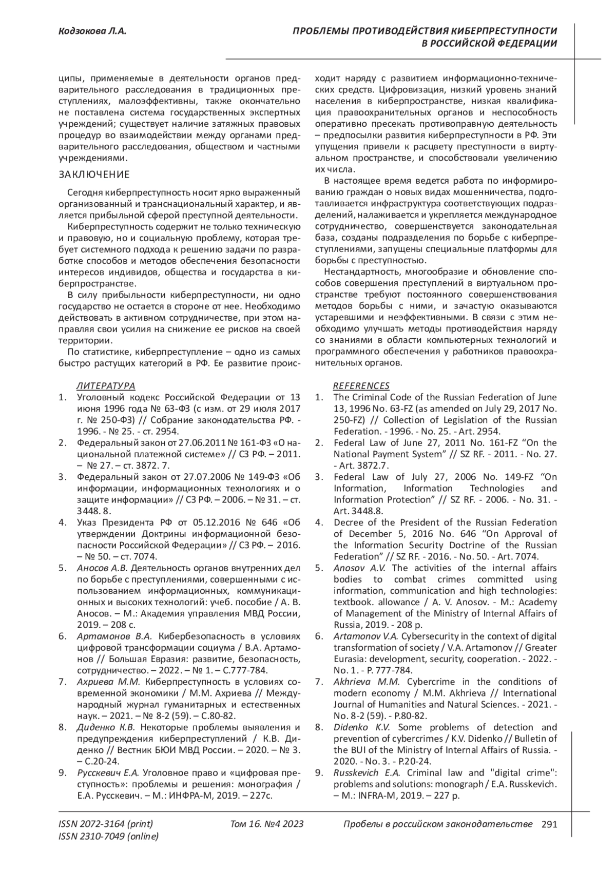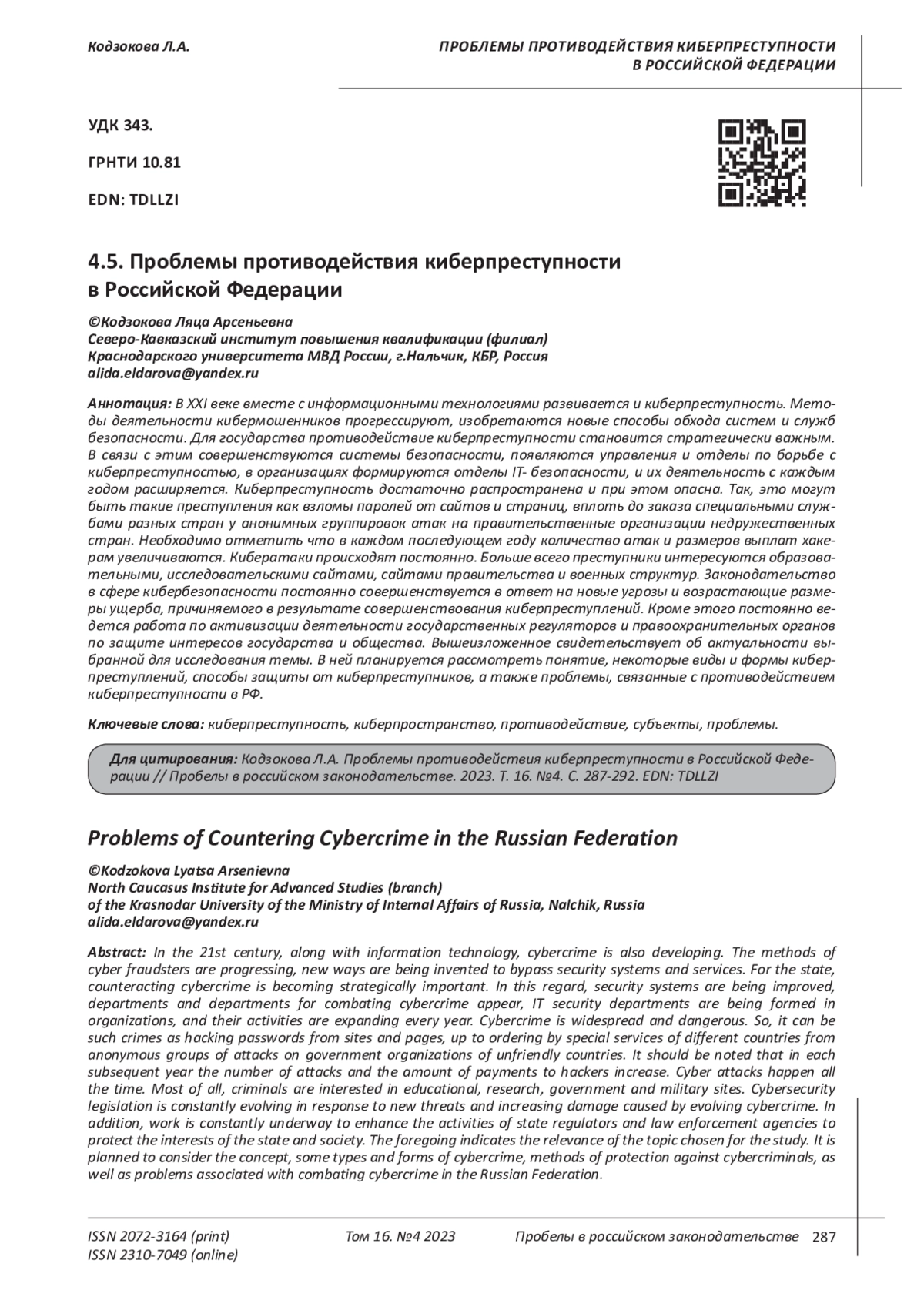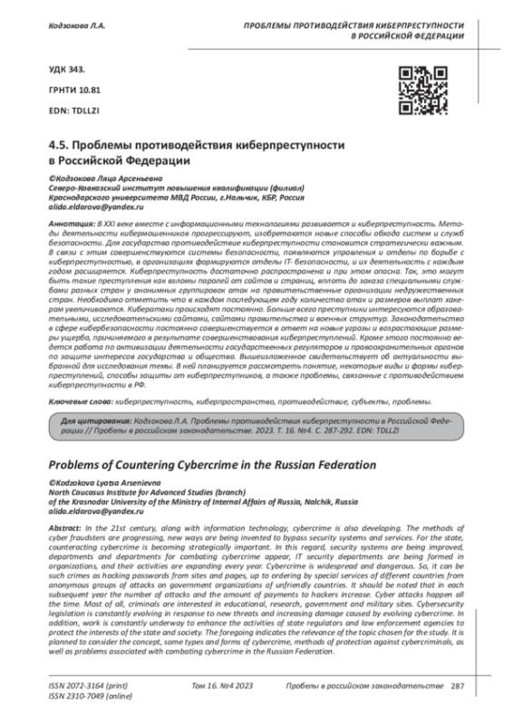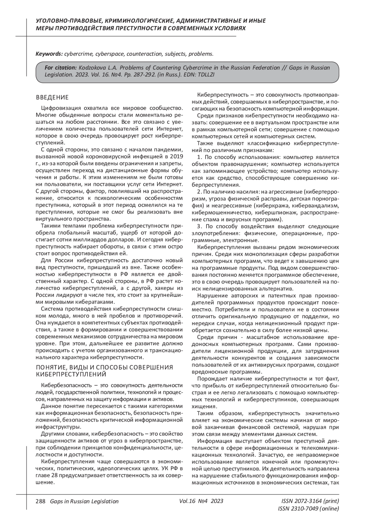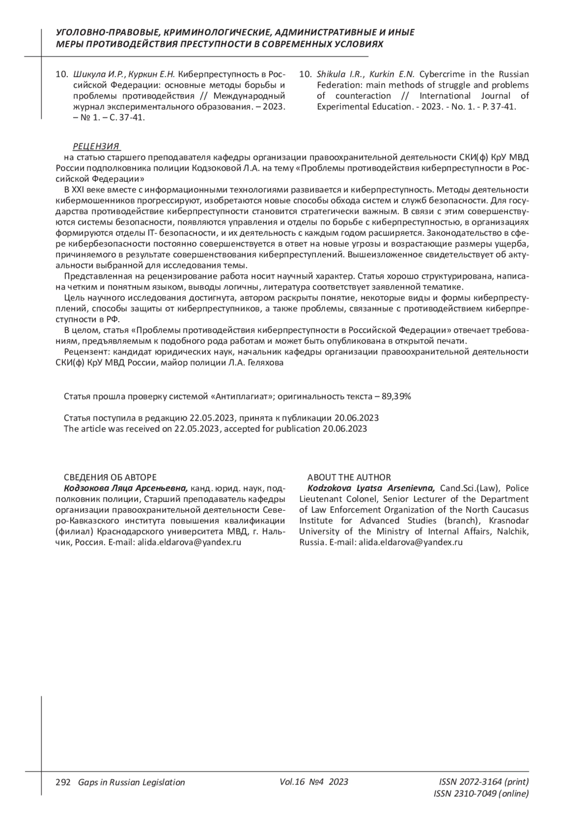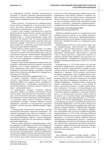 Shikula I.R., Kurkin E.N. Cybercrime in the Russian Federation: main methods of struggle and problems of counteraction // International Journal of Experimental Education. - 2023. - No. 1. - P. 37-41. EDN: CESTGI