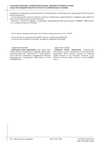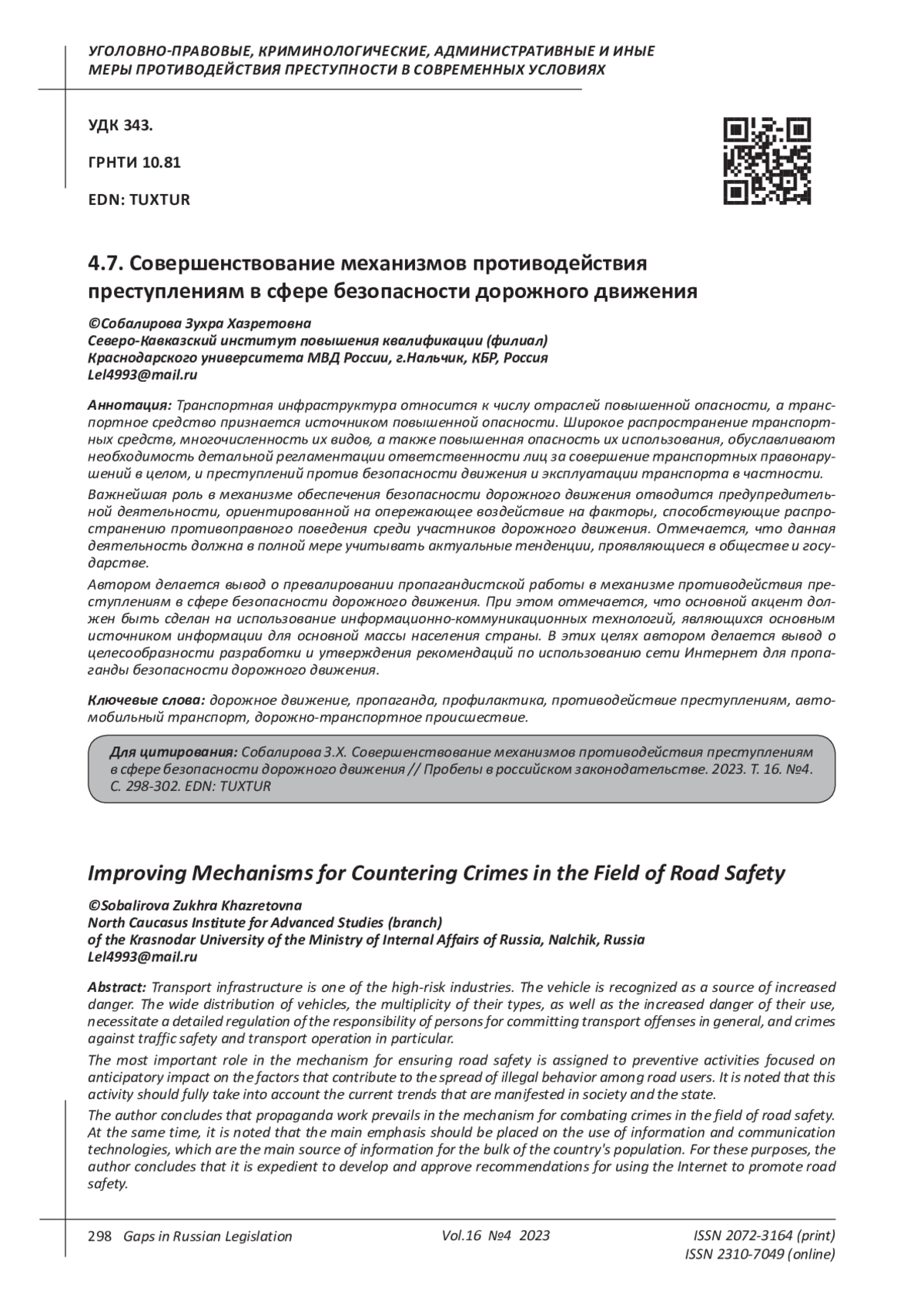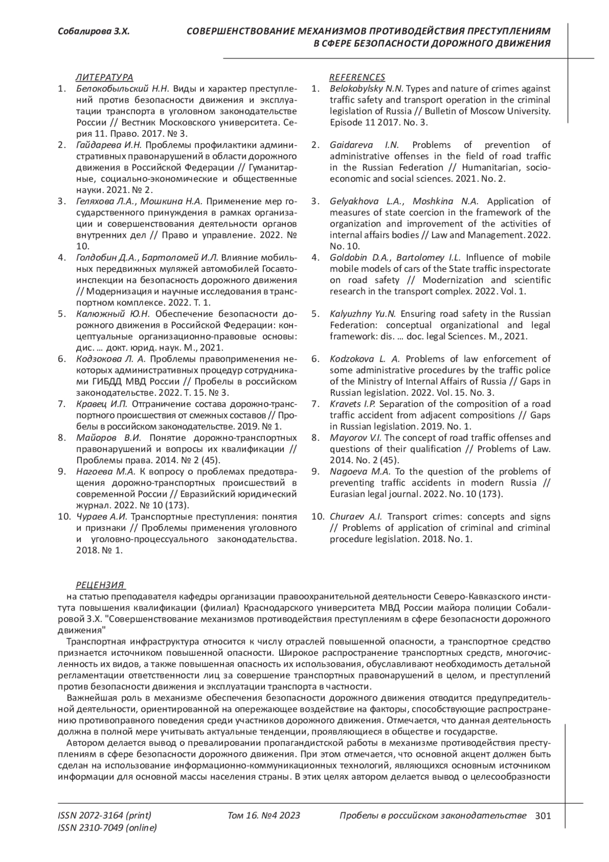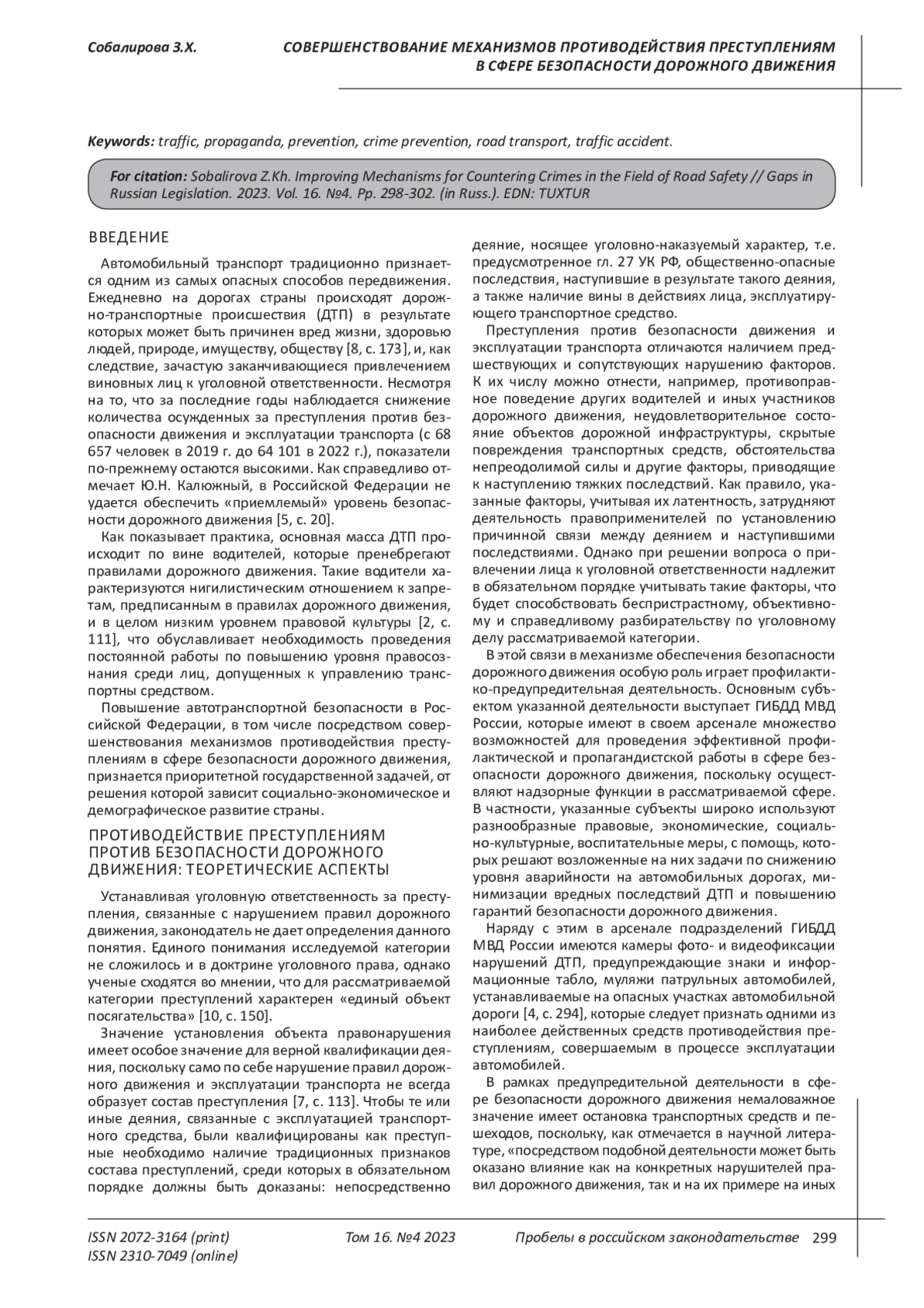 СОБАЛИРОВА З. Х. СОВЕРШЕНСТВОВАНИЕ МЕХАНИЗМОВ ПРОТИВОДЕЙСТВИЯ ПРЕСТУПЛЕНИЯМ В СФЕРЕ БЕЗОПАСНОСТИ ДОРОЖНОГО ДВИЖЕНИЯ // ПРОБЕЛЫ В РОССИЙСКОМ ЗАКОНОДАТЕЛЬСТВЕ. 2023. Т. 16 № 4