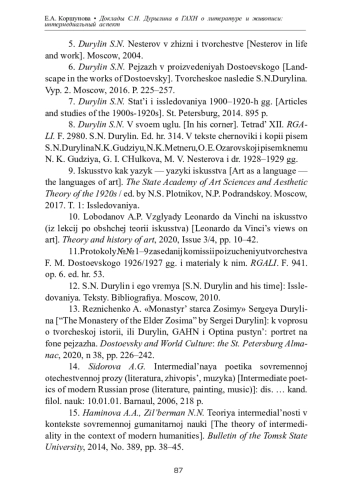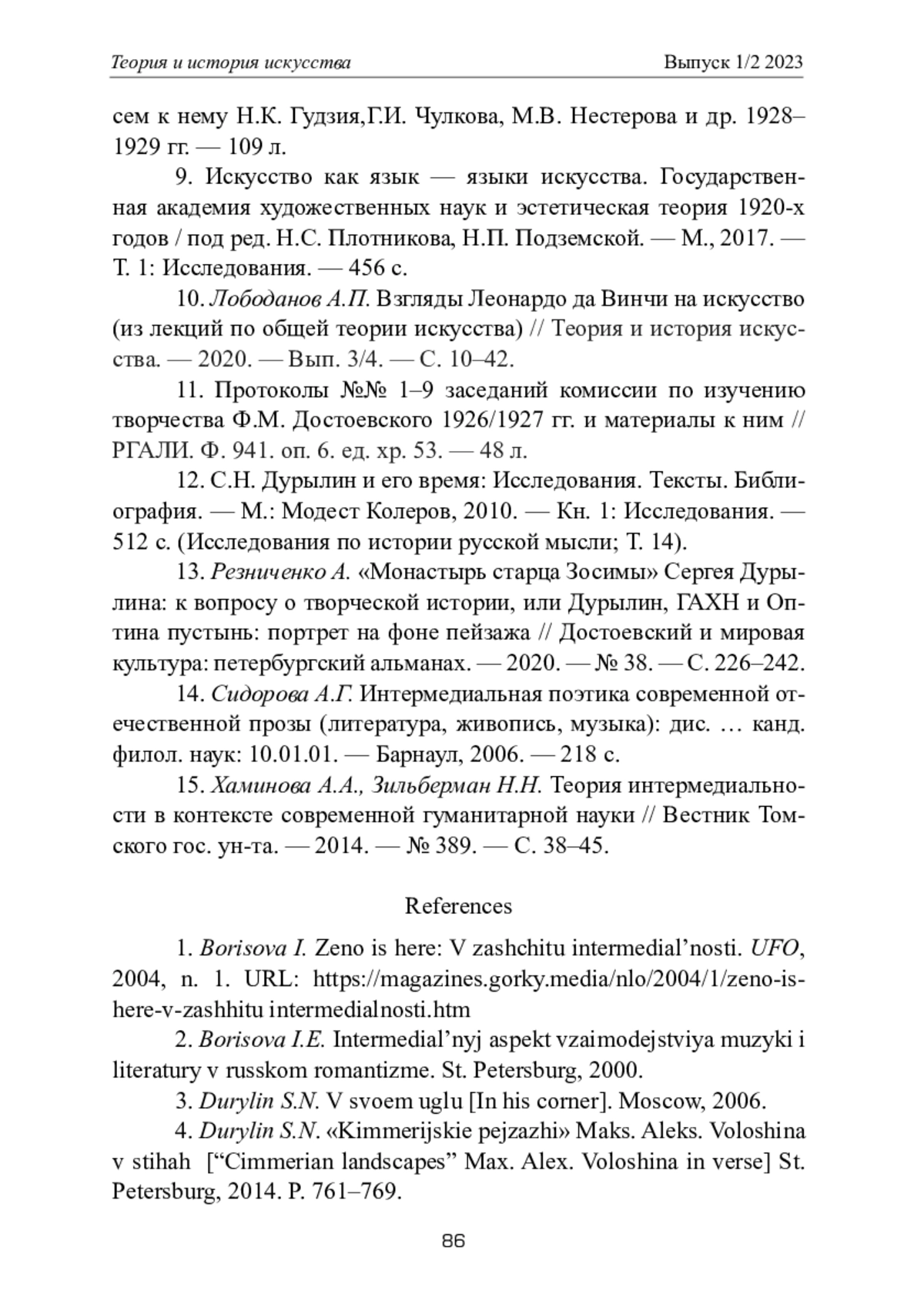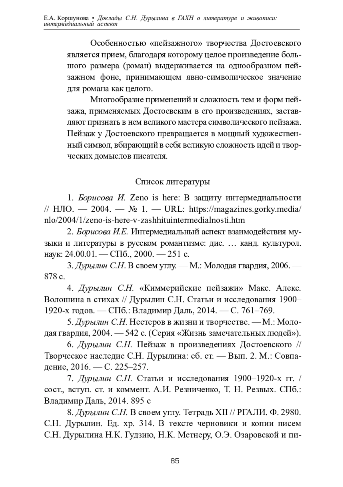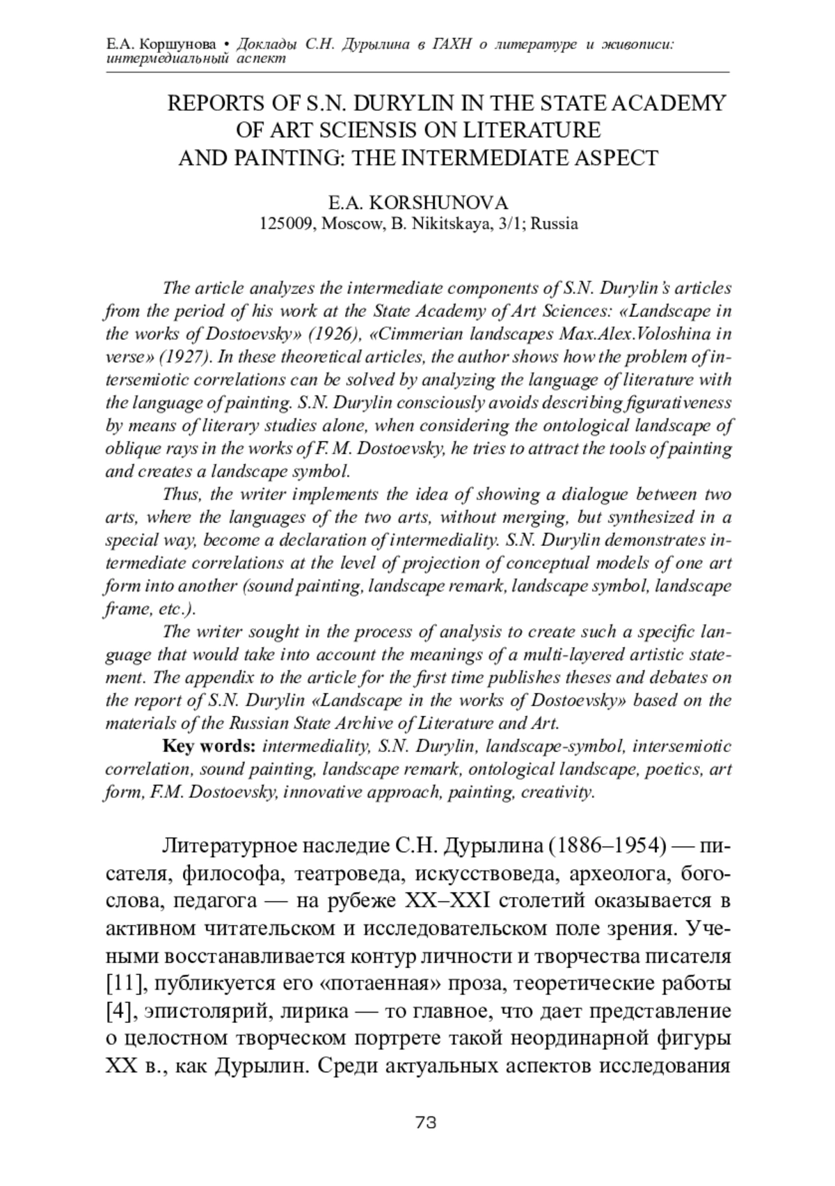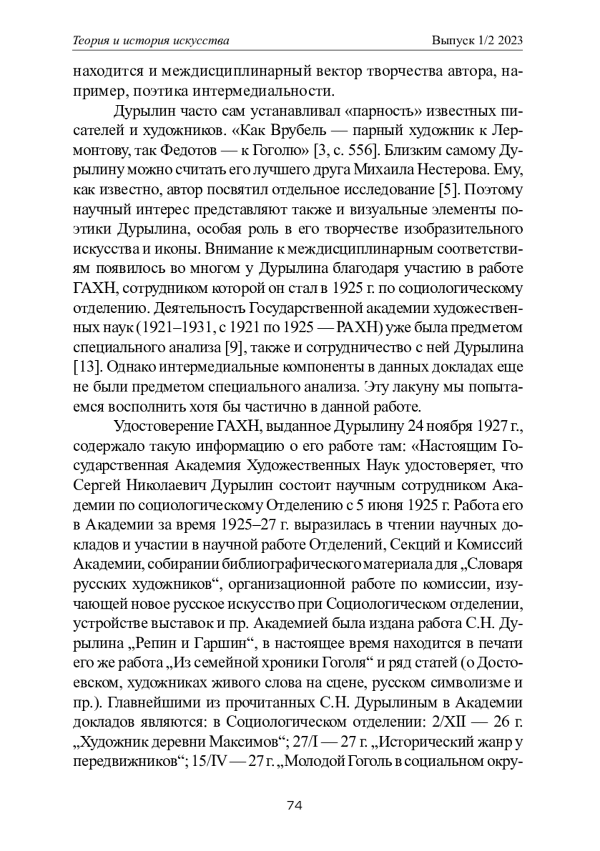 КОРШУНОВА Е. А. ДОКЛАДЫ C. Н. ДУРЫЛИНА В ГАХН О ЛИТЕРАТУРЕ И ЖИВОПИСИ: ИНТЕРМЕДИАЛЬНЫЙ АСПЕКТ // ТЕОРИЯ И ИСТОРИЯ ИСКУССТВА. 2023. № 1-2