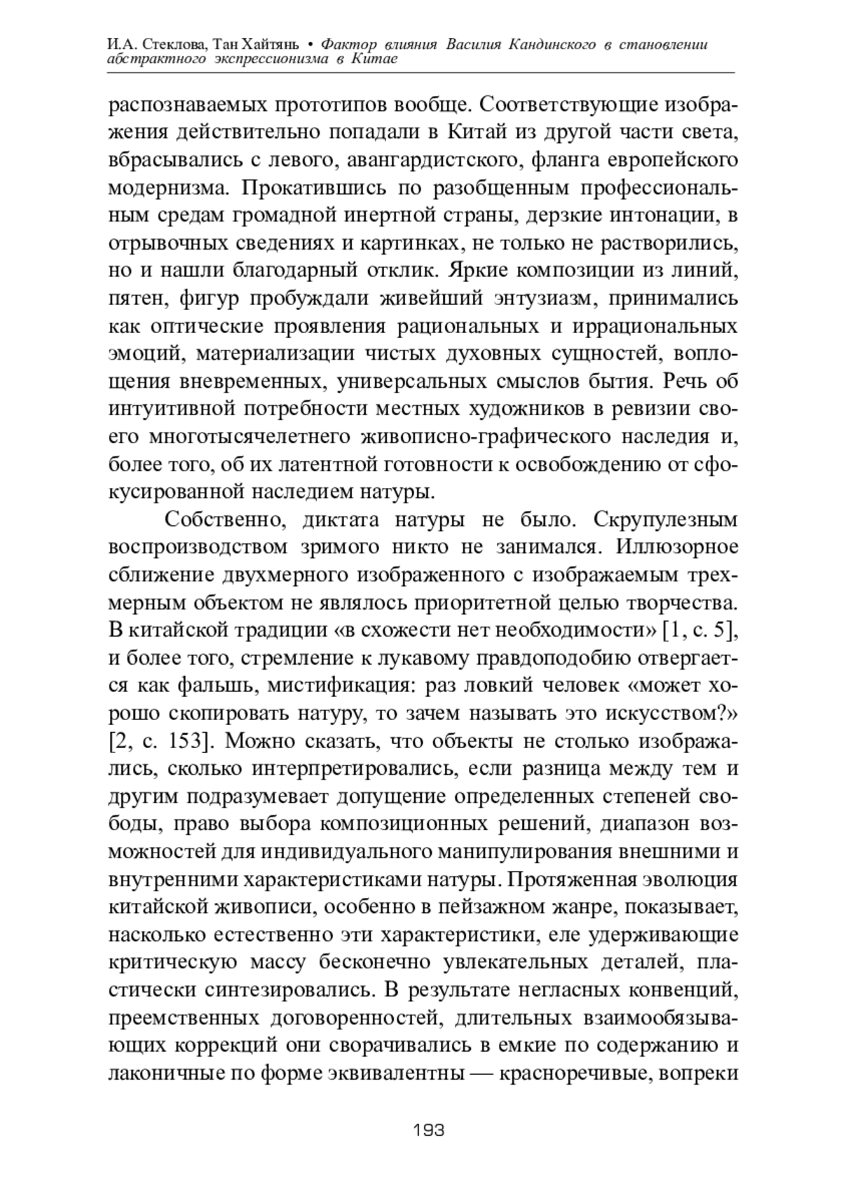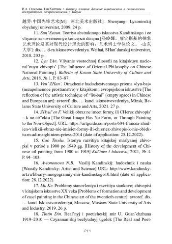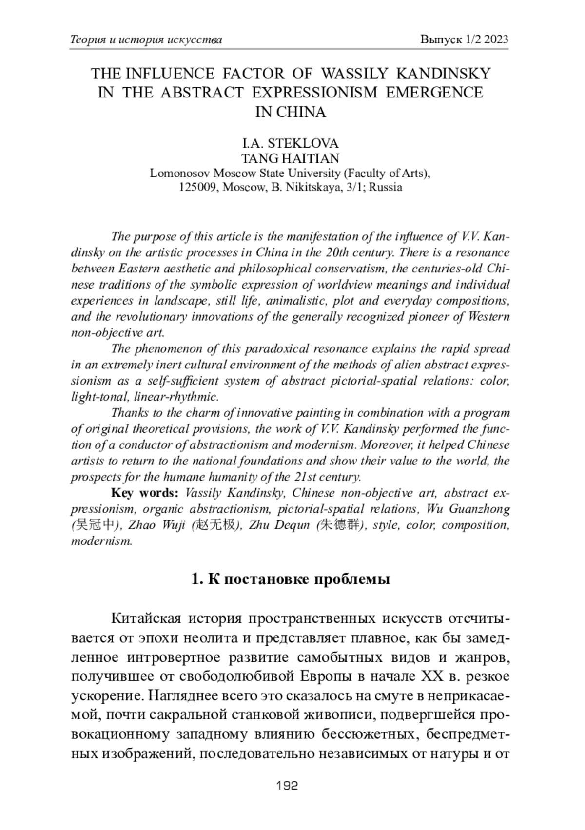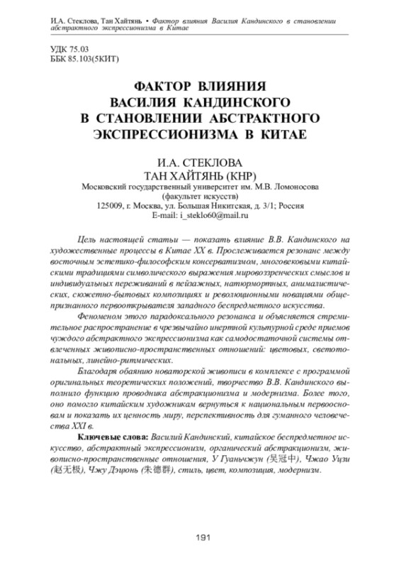 СТЕКЛОВА И. А., ТАН Х. ФАКТОР ВЛИЯНИЯ ВАСИЛИЯ КАНДИНСКОГО В СТАНОВЛЕНИИ АБСТРАКТНОГО ЭКСПРЕССИОНИЗМА В КИТАЕ // ТЕОРИЯ И ИСТОРИЯ ИСКУССТВА. 2023. № 1-2