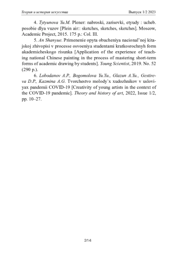 6. Лободанов А.П., Богомолова Ю.Ю., Глазун А.Ю., Жестырёва Д.П., Казьмина А.Г. Творчество молодых художников в условиях пандемии COVID-19 // Теория и история искусства. - 2022. Вып. 1/2. - С. 10-27. EDN: CJLSGE