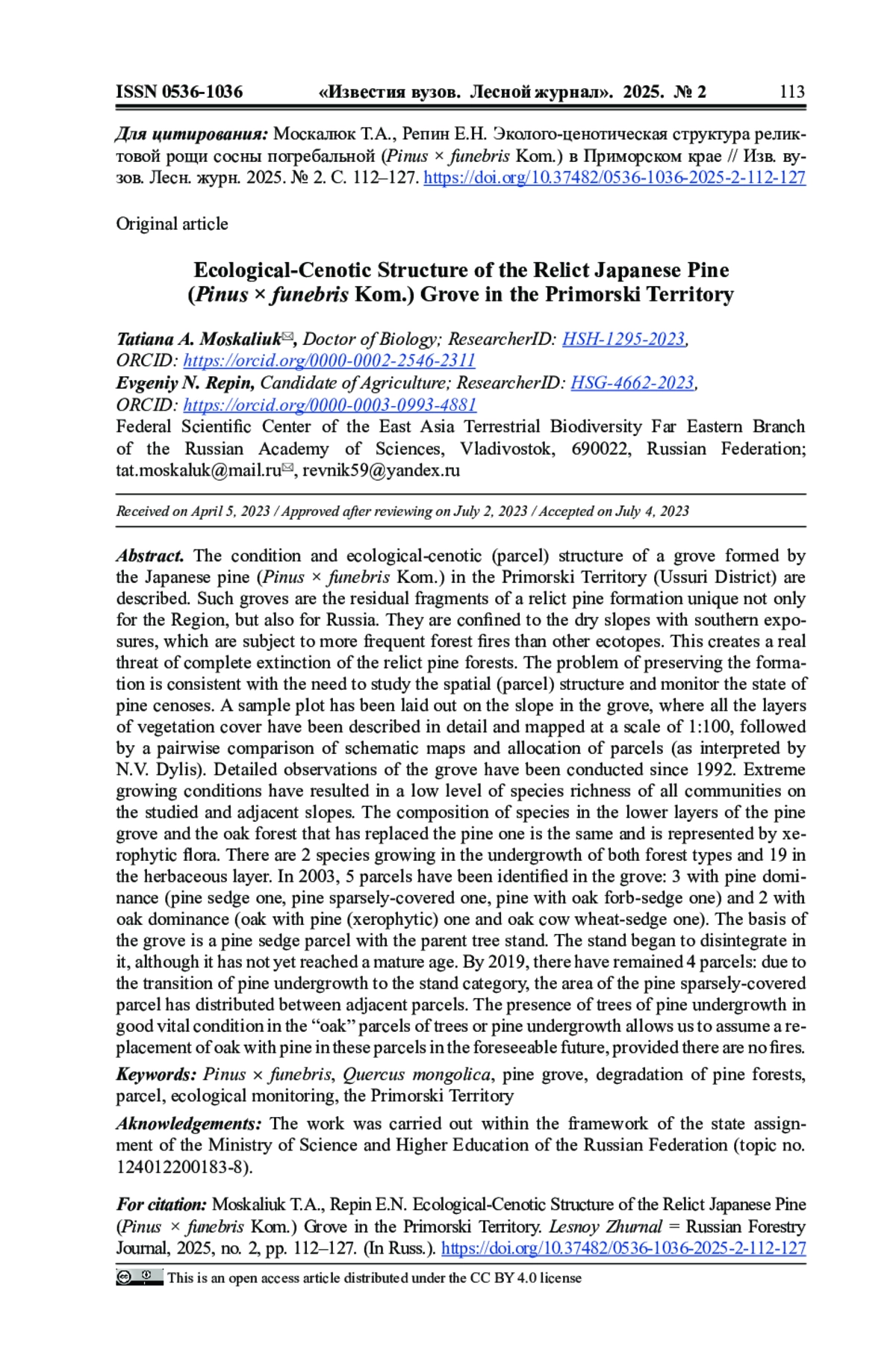 Repin E.N. The Japanese Pine in the Forest Lands of the Mountain Taiga Station of the Far East Branch of the Russian Academy of Sciences. Biological Research in Natural and Cultural Ecosystems of the Primorski Territory. Vladivostok, Dal’nauka Publ., 1993, pp. 82-91. (In Russ.).