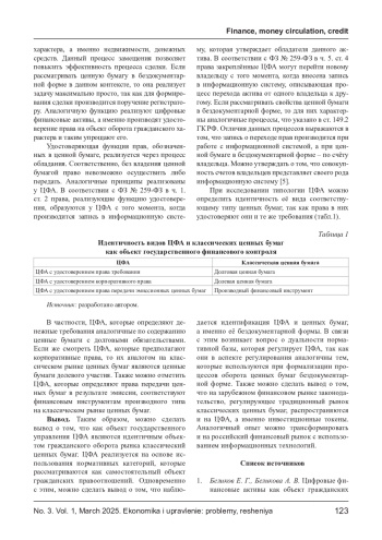 1. Беликов Е. Г., Беликова А. В. Цифровые финансовые активы как объект гражданских прав // Вестник СГЮА. - 2019. - № 6. - С. 45-48. EDN: KLYVCE