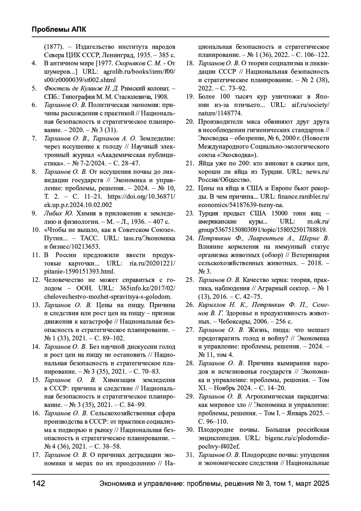 27. Тарханов О. В. Жизнь, пища: что мешает предотвратить голод и войну? // Экономика и управление: проблемы, решения. - 2024. - № 11, том 4. EDN: EDUANI