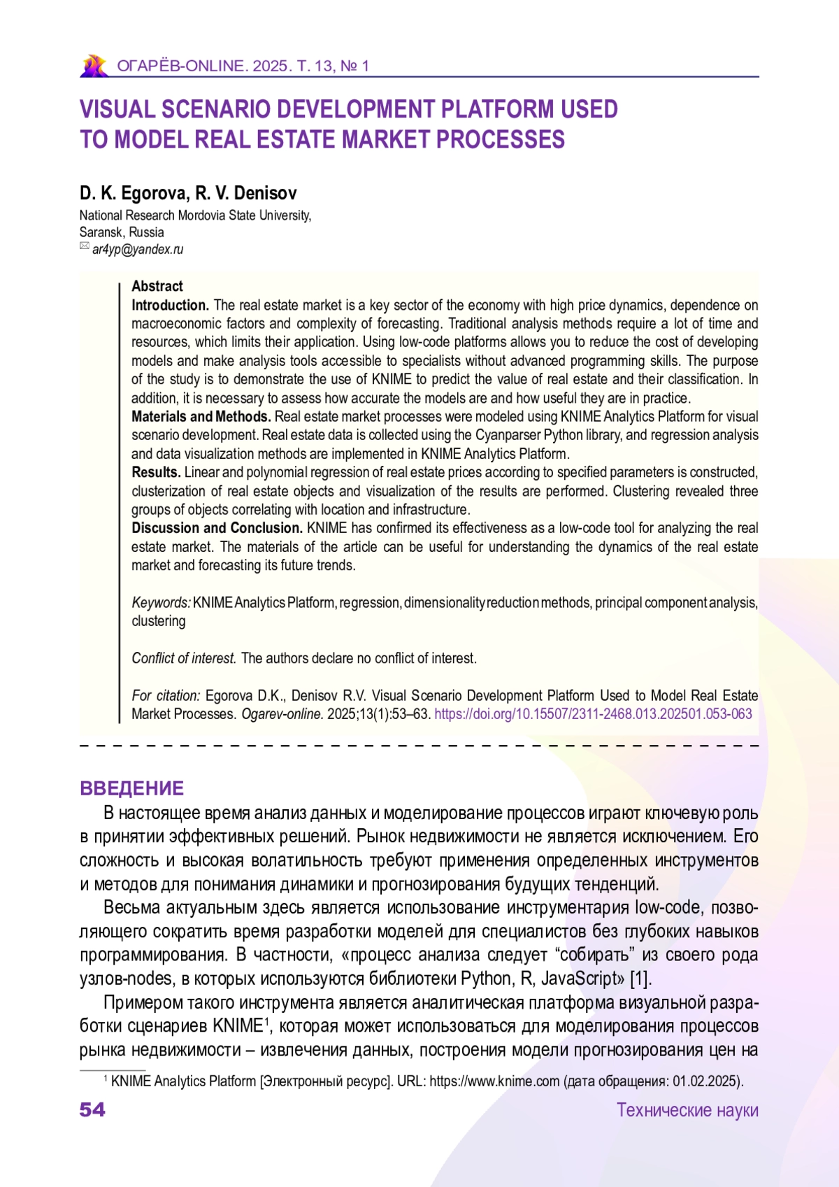 Обсуждение и заключение. KNIME подтвердил эффективность как low-code инструмент для анализа рынка недвижимости. Материалы статьи могут быть полезны для понимания динамики рынка недвижимости и прогнозирования его будущих тенденций.