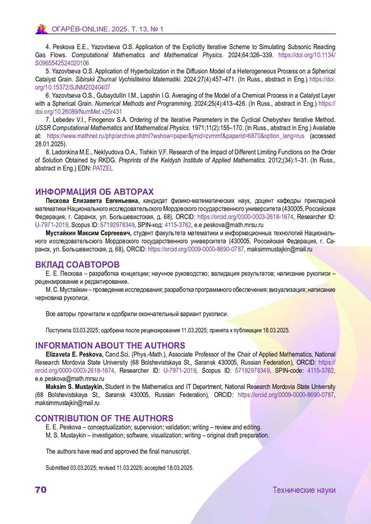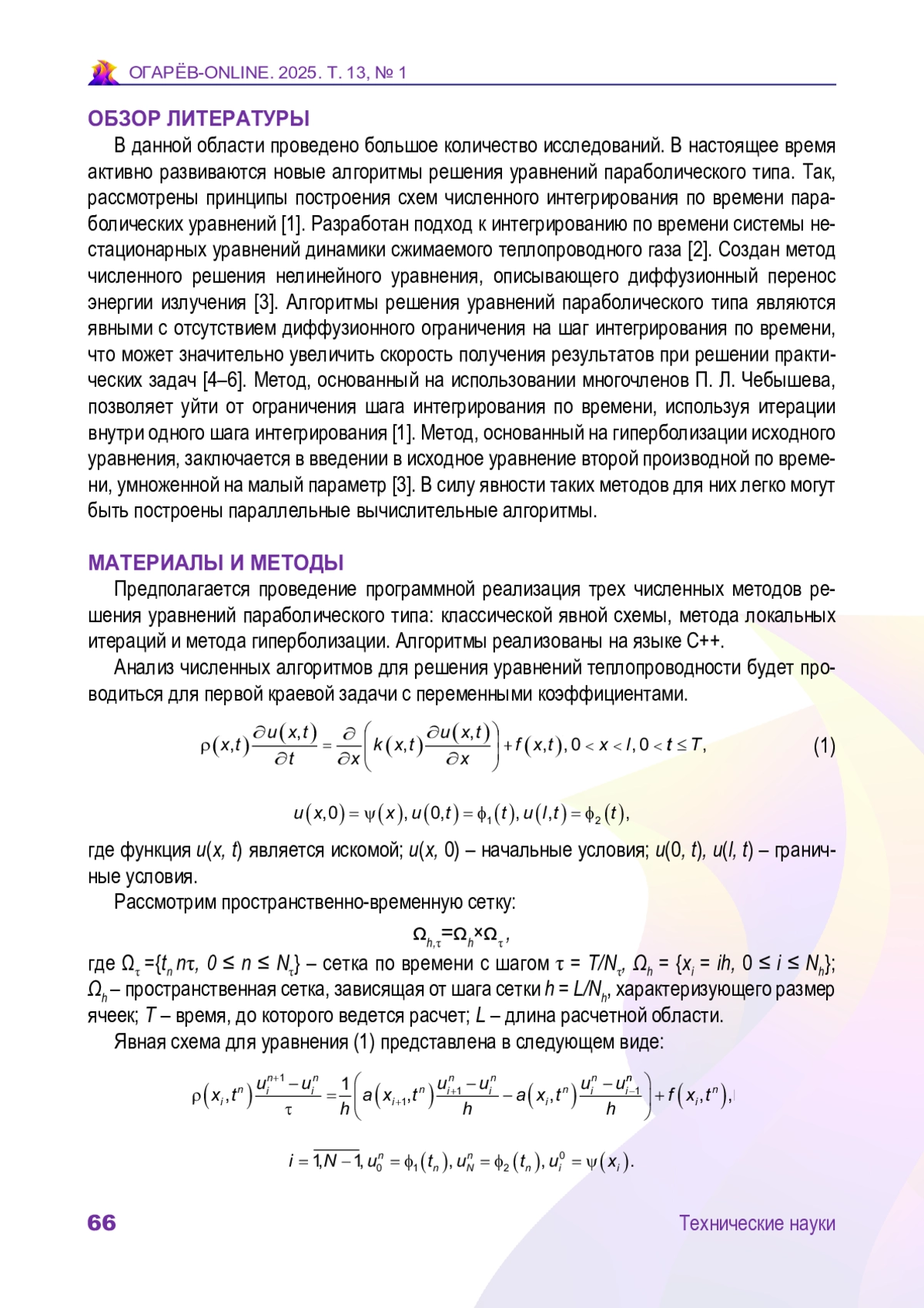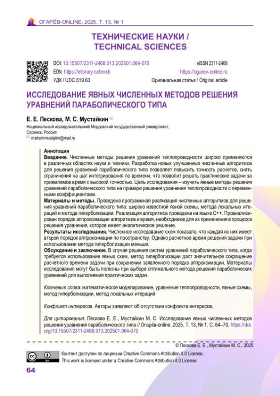 ПЕСКОВА Е. Е., МУСТАЙКИН М. С. ИССЛЕДОВАНИЕ ЯВНЫХ ЧИСЛЕННЫХ МЕТОДОВ РЕШЕНИЯ УРАВНЕНИЙ ПАРАБОЛИЧЕСКОГО ТИПА // ОГАРЁВ-ONLINE. 2025. № 1 (218), ТОМ 13