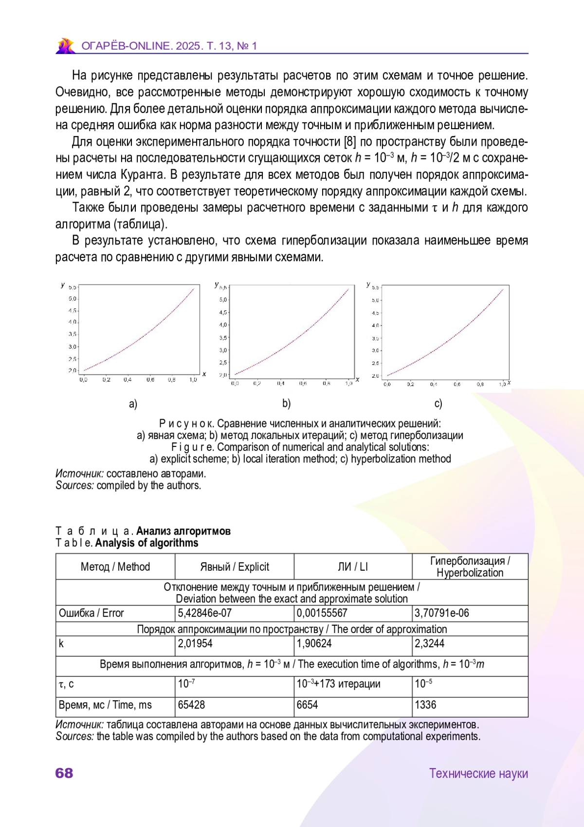 Обсуждение и заключение. В случае решения систем уравнений параболического типа, когда требуется использование явных схем, метод гиперболизации даст значительное сокращение расчетного времени задачи при сохранении заявленного порядка аппроксимации. Материалы исследования могут быть полезны при выборе оптимального метода решения параболических уравнений для выполнения практических задач.