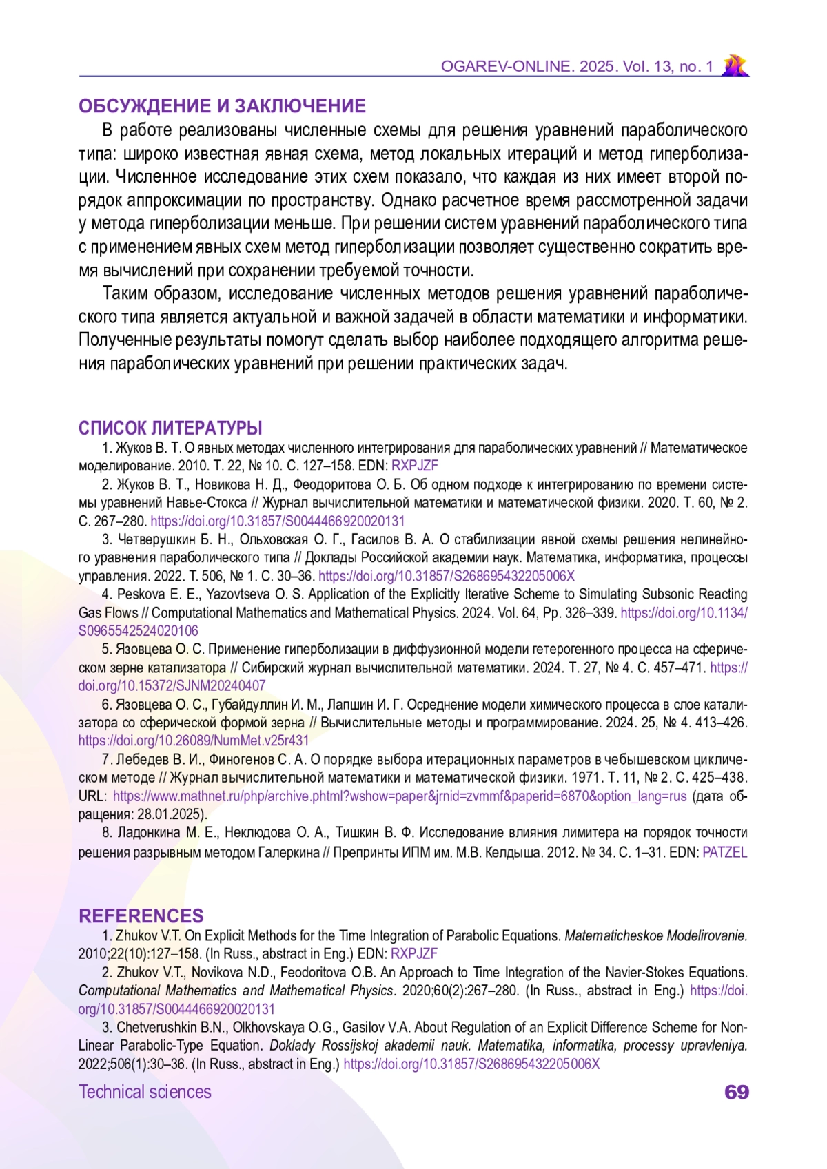 Статья: ИССЛЕДОВАНИЕ ЯВНЫХ ЧИСЛЕННЫХ МЕТОДОВ РЕШЕНИЯ УРАВНЕНИЙ ПАРАБОЛИЧЕСКОГО ТИПА (2025)