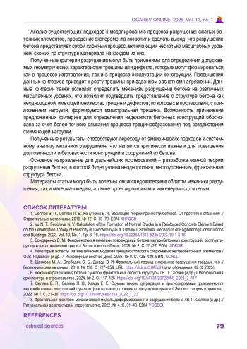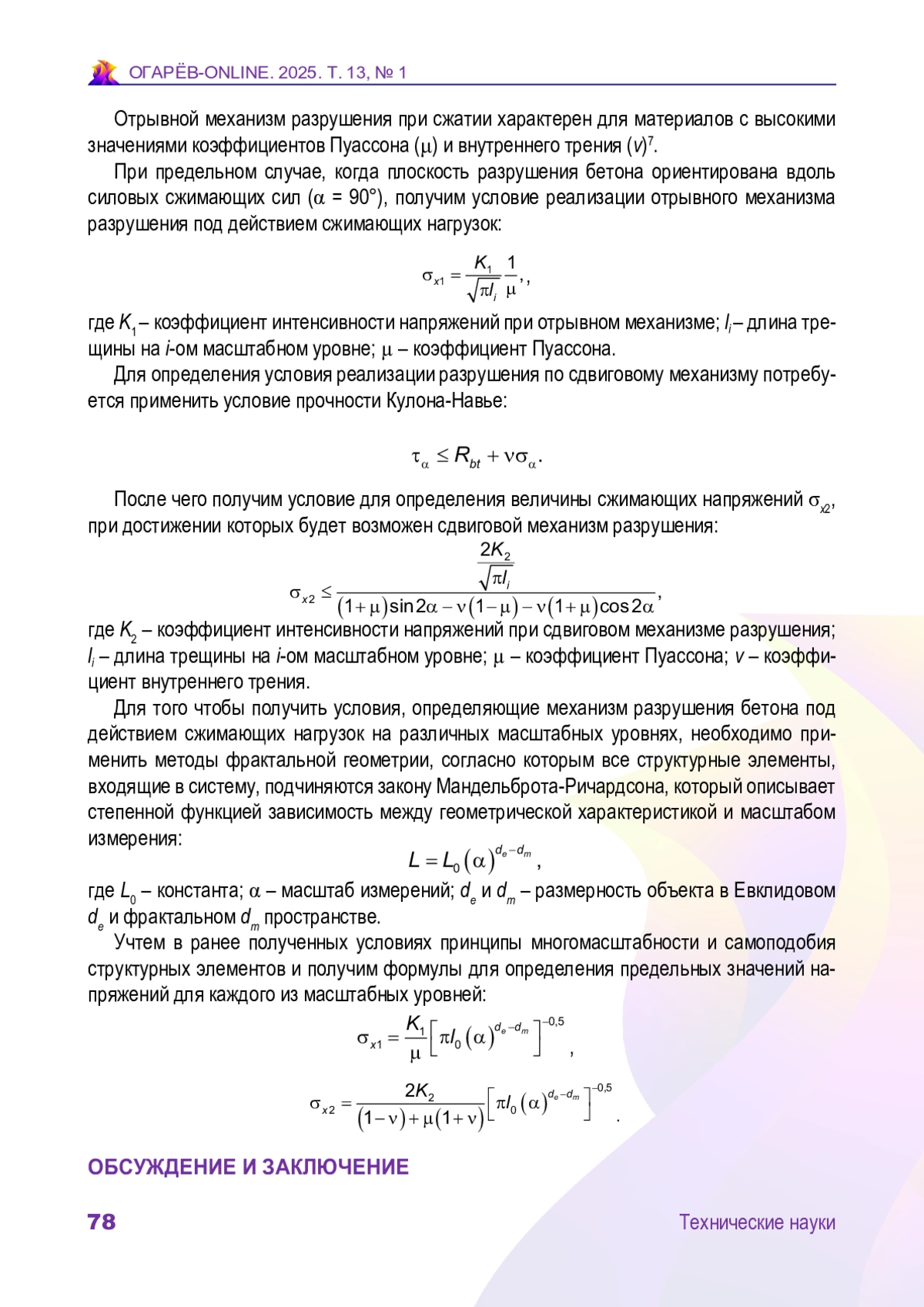 Обсуждение и заключение. Предложенные критерии разрушения позволят определить, как протекает механизм разрушения на различных масштабных уровнях и каким образом происходит смена накопления и расхода энергии. Данные результаты будут полезны для исследователей механики разрушения бетона, так как позволят более точно определять процесс микротрещинообразования, что позволит повысить надежность конструкций из бетона.