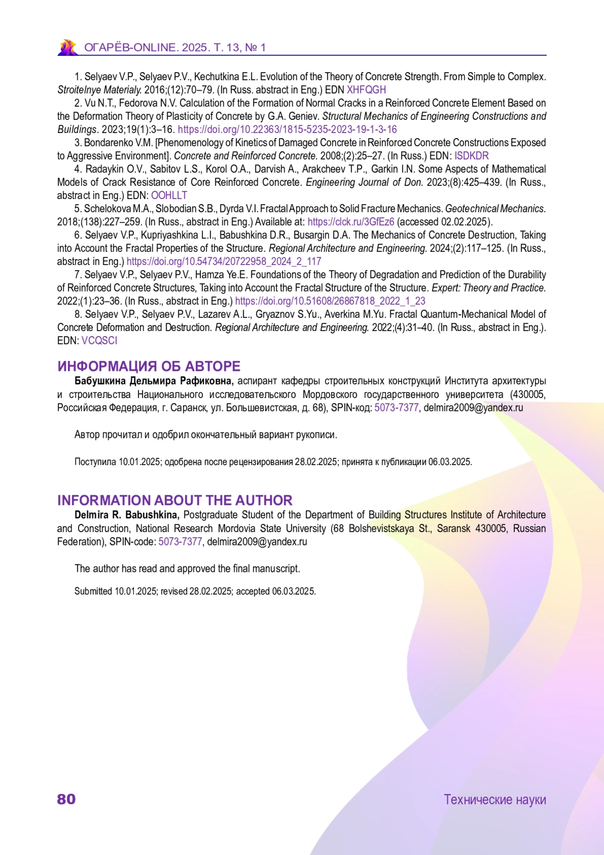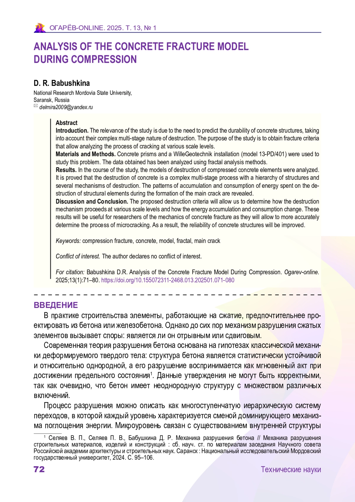 БАБУШКИНА Д. Р. АНАЛИЗ МОДЕЛИ РАЗРУШЕНИЯ БЕТОНА ПРИ СЖАТИИ // ОГАРЁВ-ONLINE. 2025. № 1 (218), ТОМ 13