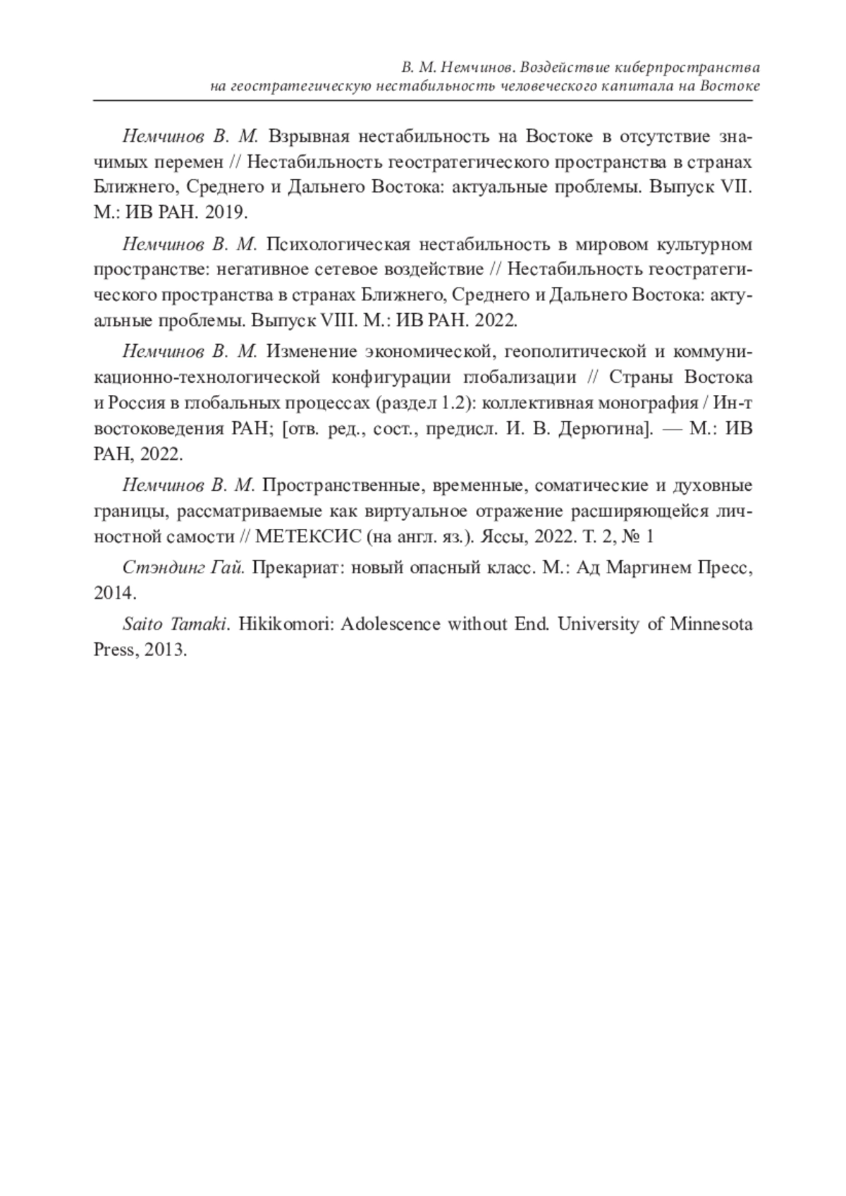 10. Немчинов В. М. Пространственные, временные, соматические и духовные границы, рассматриваемые как виртуальное отражение расширяющейся личностной самости // МЕТЕКСИС (на англ. яз.). Яссы, 2022. Т. 2, № 1 Стэндинг Гай. Прекариат: новый опасный класс. М.: Ад Маргинем Пресс, 2014.