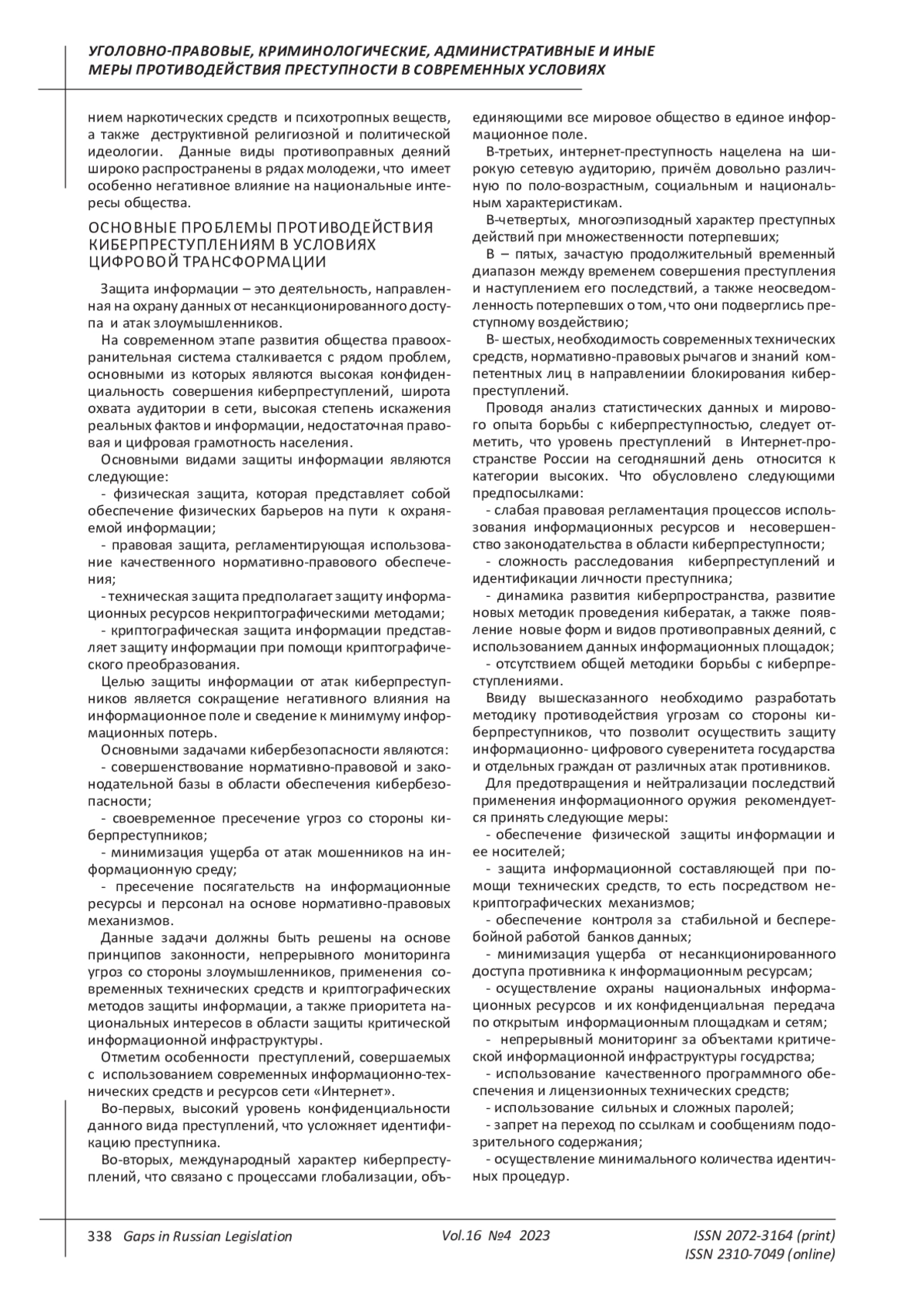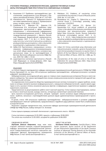 Статья: ОБ АКТУАЛЬНЫХ ПРОБЛЕМАХ ПРОТИВОДЕЙСТВИЯ КИБЕРПРЕСТУПЛЕНИЯМ В УСЛОВИЯХ ЦИФРОВОЙ ТРАНСФОРМАЦИИ (2023)