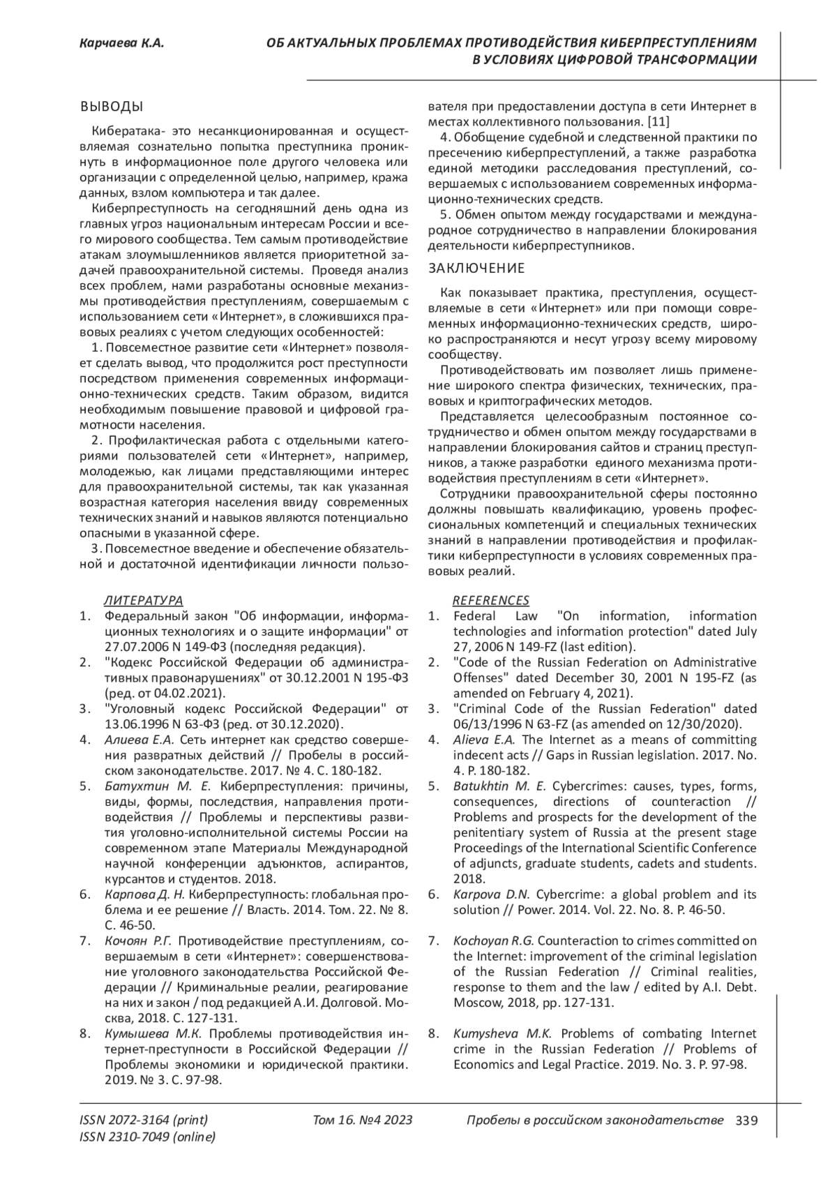 КАРЧАЕВА К. А. ОБ АКТУАЛЬНЫХ ПРОБЛЕМАХ ПРОТИВОДЕЙСТВИЯ КИБЕРПРЕСТУПЛЕНИЯМ В УСЛОВИЯХ ЦИФРОВОЙ ТРАНСФОРМАЦИИ // ПРОБЕЛЫ В РОССИЙСКОМ ЗАКОНОДАТЕЛЬСТВЕ. 2023. Т. 16 № 4