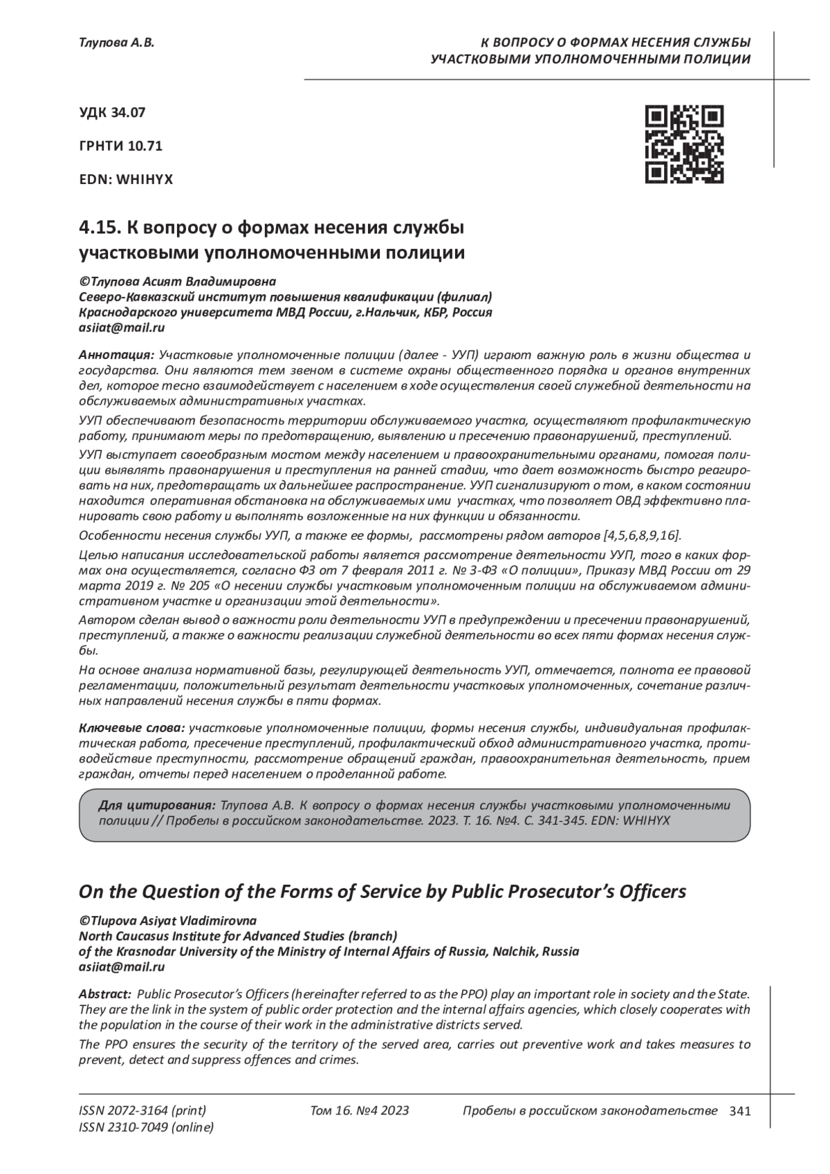 4. Антонов Н.И., Бирюков В.В. Актуальные вопросы организации приема граждан участковыми уполномоченными полиции // Академическая мысль. 2021. № 3 (16). С. 126-130. EDN: TEJEZP